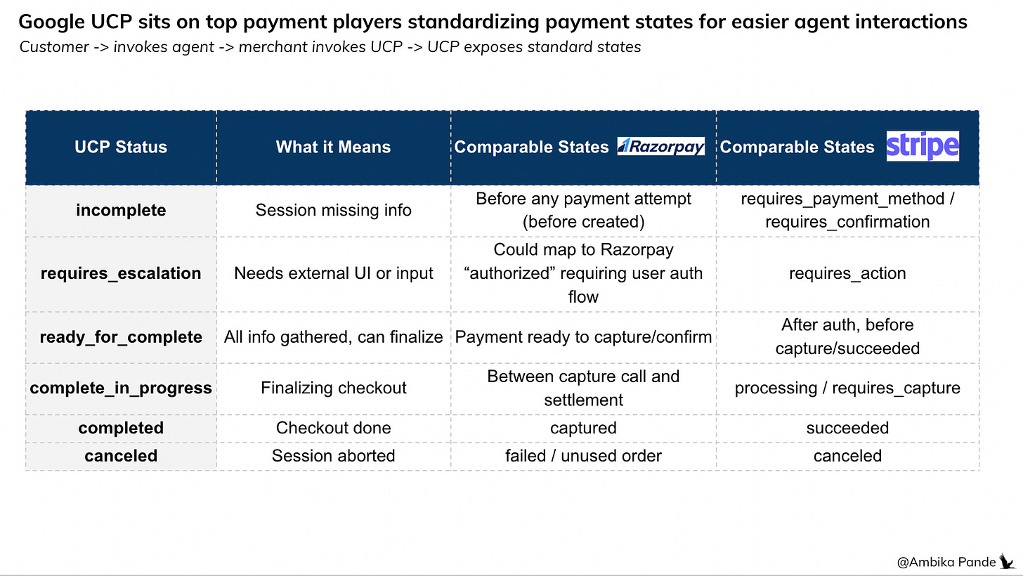 The merchant exposes a UCP endpoint across payment providers for a standardized template for the agent to interact with. Earlier, the agent would have to solve for different edge cases across payment providers (Stripe / Razorpay being two examples)