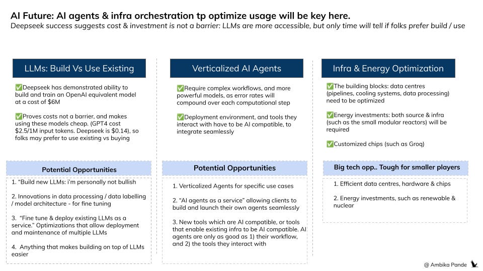 Of course, Deepseek coming in, and building their LLM at a fraction of the cost ( reportedly it cost them $6M), raises other questions around how the West has optimized building LLMs, the astronomical fund raises, and valuations of AI companies currently.