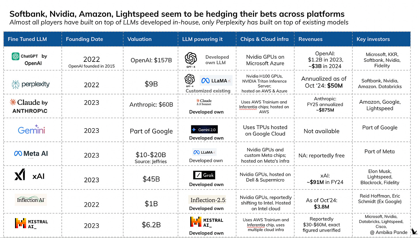 Here’s something that’s interesting. A lot of investors have invested across platforms: Example, Nvidia has invested in both OpenAI and perplexity, while Amazon has invested in Perplexity and Claude. Multiple players are invested in multiple LLMs. Even though they’ve built their own. You can check out the table below for key investors across LLMs.