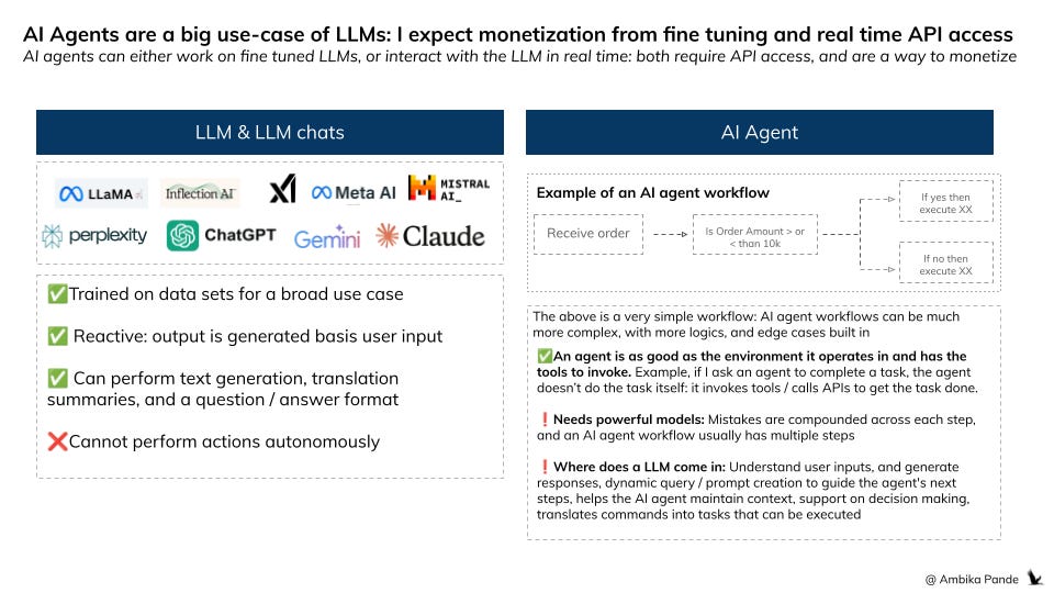 And if AI agents are the future, then you need company software & tools that are compatible with AI agents & LLM integrations, so apart from AI agents, I see an opportunity for companies to build new CRMs, Financial, Accounting Tools which are AI & AI agent compatible, OR provide a way for existing systems to upgrade to be AI compatible. Even opportunities such as “AI agents as a service” which enable companies to build and deploy their own AI agents is something that is coming up. And that’s probably why there is so much investment in AI agent companies. The AI agent start-ups of today will most probably replace a large bunch of the services business of tomorrow. And LLMs will power all of that.