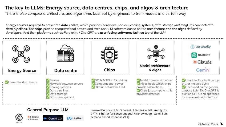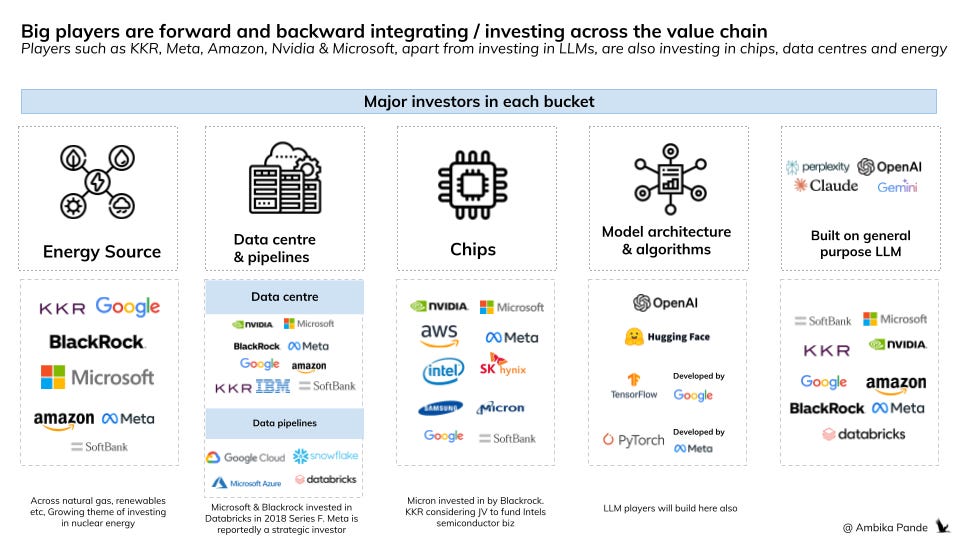 1. The data centre hosts the hardware & servers that run on the chips (GPUs). The chips are used to perform the calculations during the training and inference phase of LLMs. It also provides power access - these data centres need access to large amounts of electricity to power the calculations being done. (other pieces such as cooling centres, data storage & management etc. also sit here). All your big tech players are investing here or already have them: Amazon, Meta, Google & Microsoft. And also PE giants, such as KKR & Softbank.