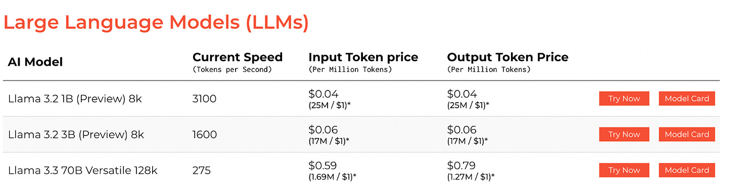 Take a look at the image below. If I want to run & deploy Llama, it’s way cheaper if I use Groq chips vs the standard Nvidia H100 chips, because Groq is optimized for LLM specific models. (ChatGPT if you recall, costs $2.5 / 1M input tokens, and they’re optimized for Nvidia H100 chips. Groq costs $0.04 / 1M input tokens)