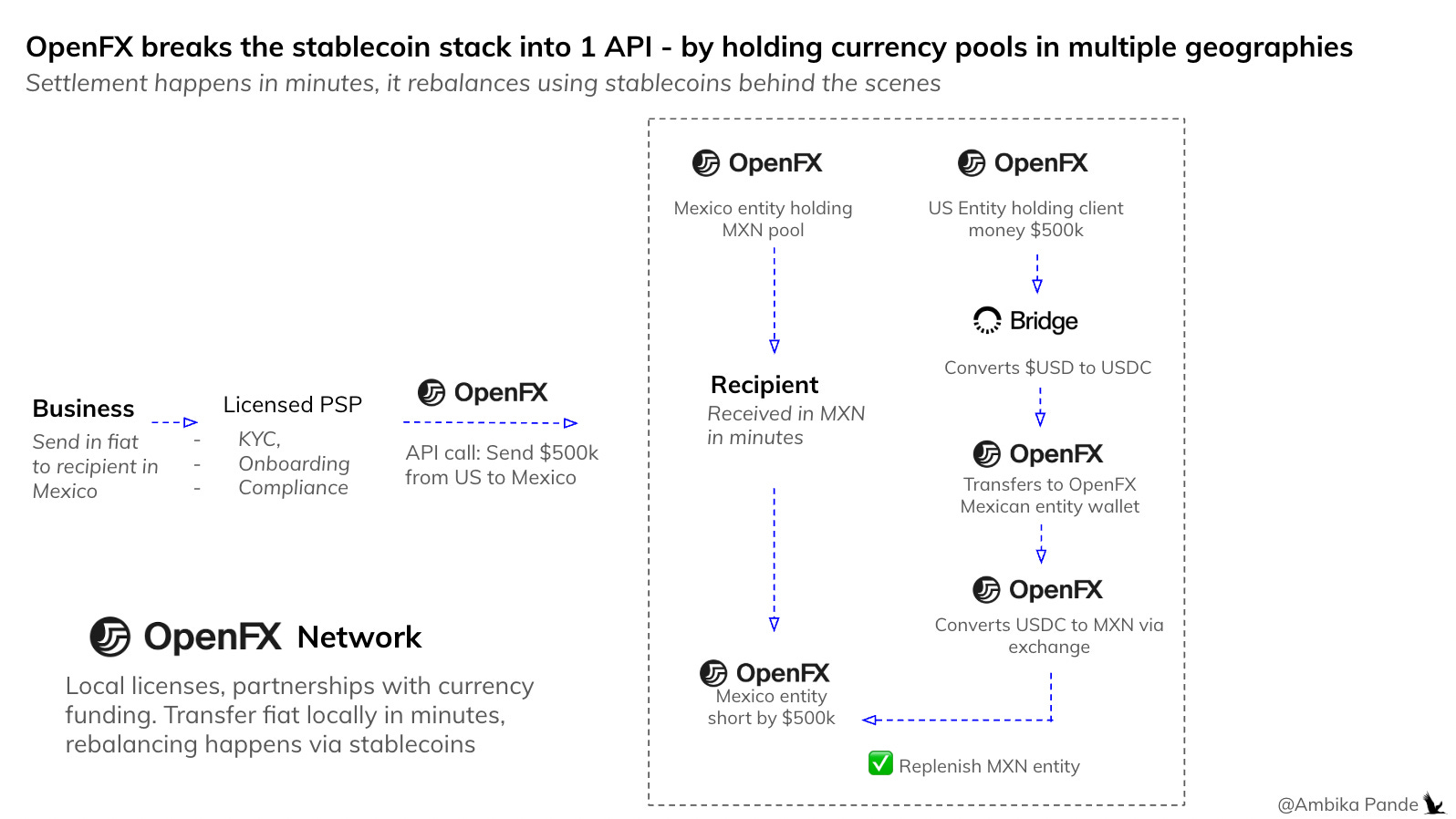 Model 2 = a neobank like Revolut or Remitly saying “I just want to offer Mexico payouts, I don’t want to get a Mexican license and park MXN there.” They plug into OpenFX. And this is exactly why Mastercard paid $1.8B for BVNK - BVNK was Model 1 with 130+ countries. That’s years of licenses, pools, and partnerships. You can’t replicate that with an API.