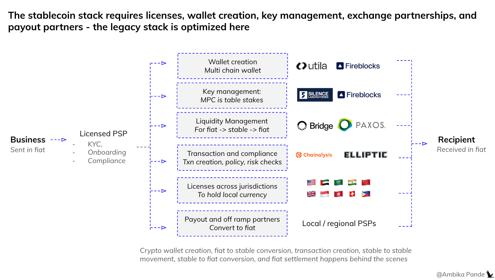 Payouts and off ramping: Businesses usually prefer settlement in fiat. So ideally you would need to convert the stablecoin into fiat before settling into the recipient wallet. This really depends on the region: some allow it, some don’t, and a lot depends on if you hold a license here. If the PSP holds a license for money movement / holding, then its easier. If not, then the PSP needs to partner with a PSP that IS licensed to hold and move money in that region, so that the final settlement can be done by their local PSP partner.