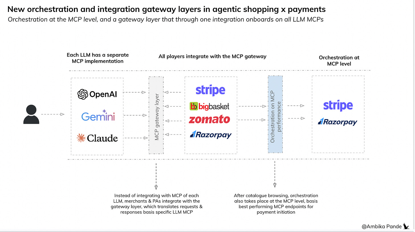 One integration with a gateway layer = integration with all LLMs: So if you’re a merchant or a PA, and you want your store or payment rails to work with all these platforms, you’d have to build for OpenAI’s MCP, build again for Claude’s MCP, and then again for Google’s MCP. That’s multiple builds, multiple formats, and a huge operational load. Enter the gateway layer. This is a single tech layer that sits between the LLMs and the merchant/payment ecosystem.