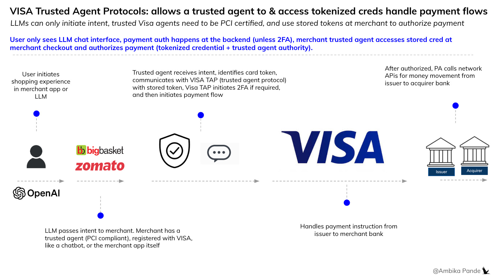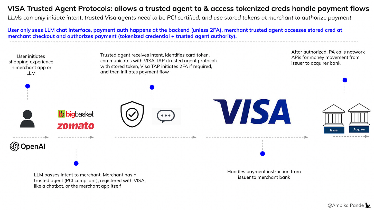 Visa launched the Visa Trusted Protocol for agentic commerce, which allows agents to initiate payments & reference stored credentials (like tokenized cards) on the end users behalf, without asking for consent again in October 2025