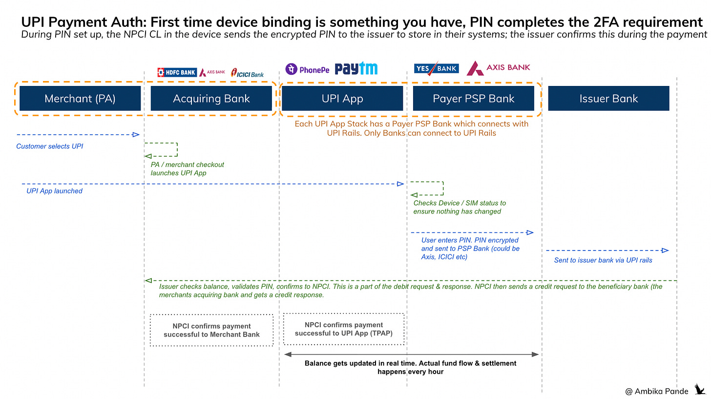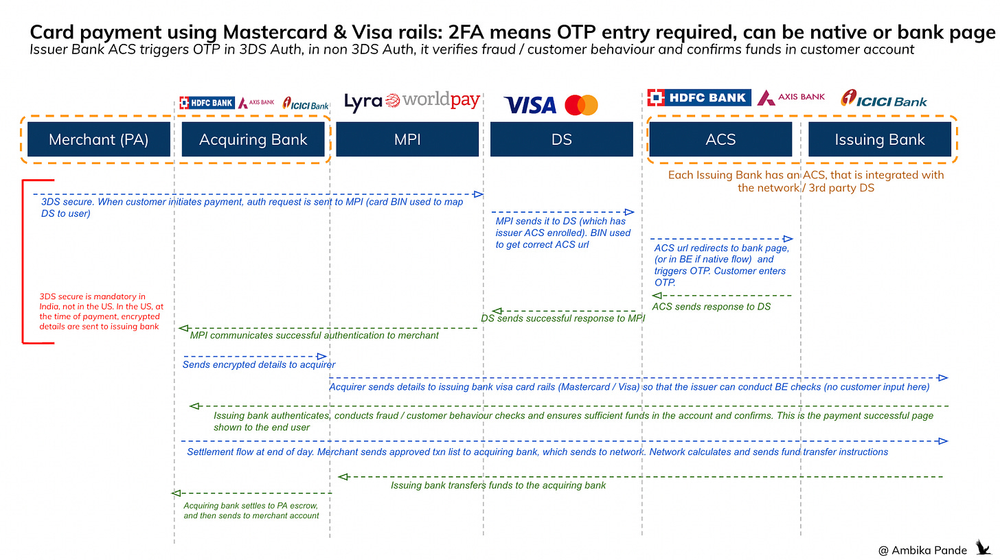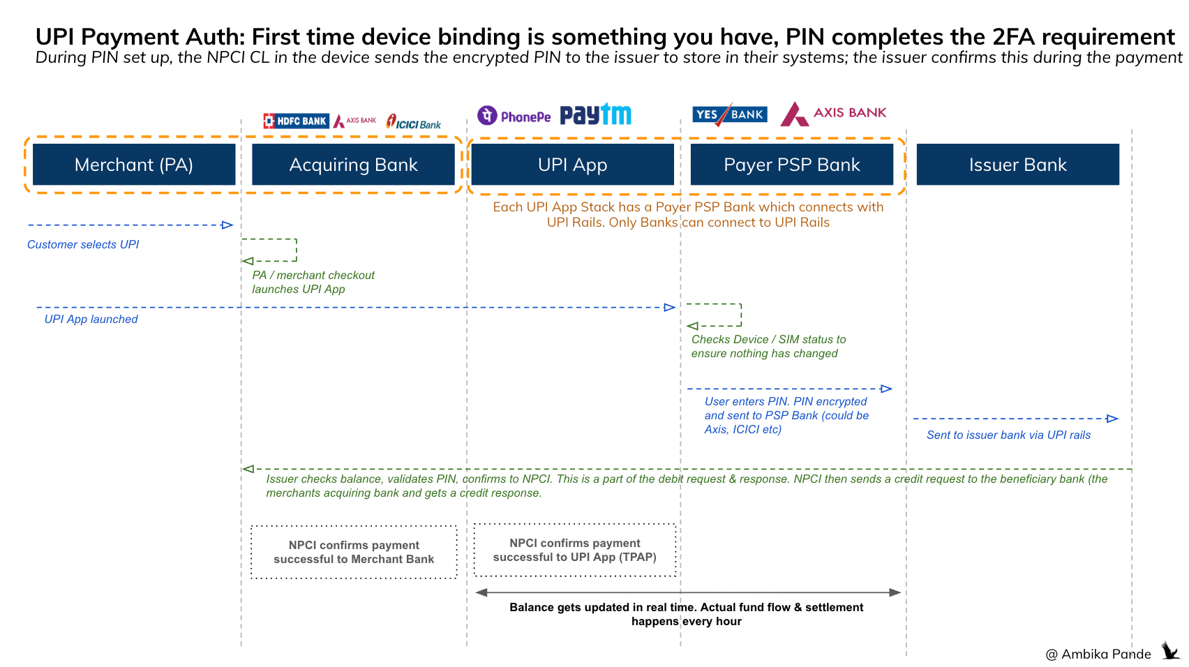 Below is the flow of authentication for card payments & UPI payments. In India, 2FA is mandated, so card payments have the card itself & the OTP. While UPI payments have the device & the PIN.