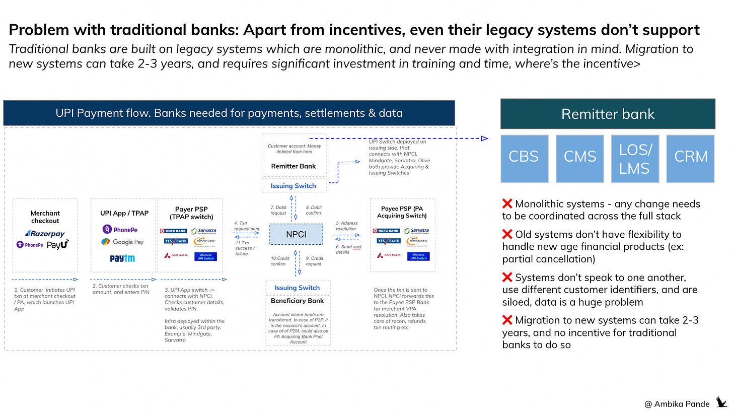👉 In the UPI Reserve Pay flow, this sort of payment works for cards - travel bookings etc. But this sits in the card management system. The debits & the credits from the savings account of the bank, sits in the core banking system. And currently, the bank CBS is not set up for this sort of payment at scale, along with other things such as reconciliation, fund flow etc. A simple example is the whole BNPL wave that hit India about 5-6 years ago. Bank systems, and the software providers they used were never set up to handle scenarios such as “grace period,” or “partial cancellation,” which were very obvious needs for consumer loans. Which resulted in a lot of manual handling.