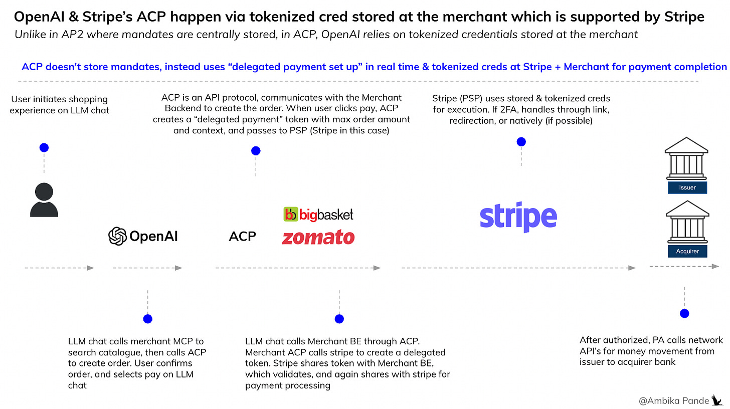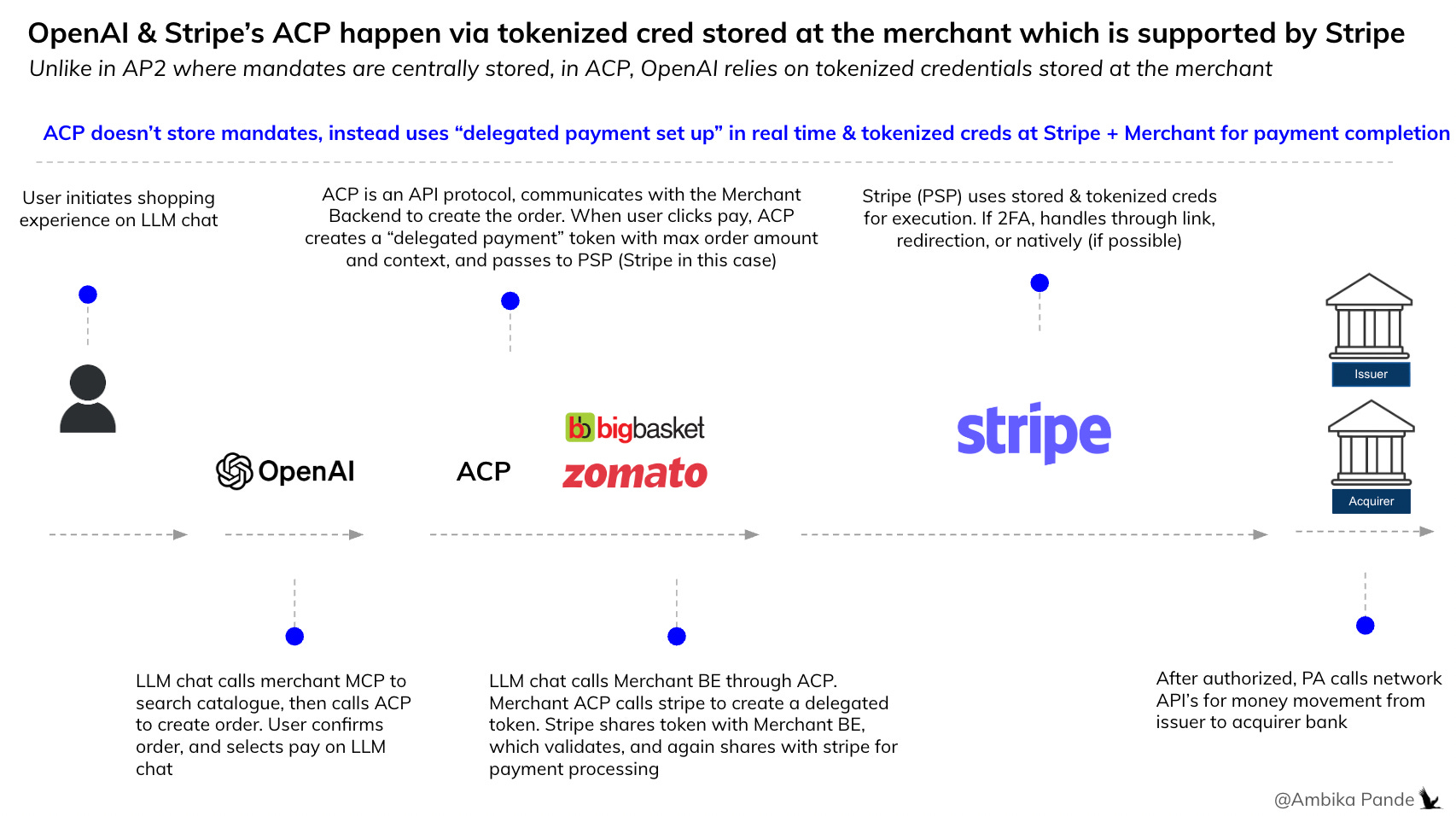 Payment authorization happens through a “delegated payment.”: Merchant ACP instructs Stripe to create a delegated payment, the payload contains a single-use token, which is scoped to specific order, merchant, and amount (e.g., INR 500), and limits potential exposure and misuse. Delegated payment token is returned to Merchant Backend. Now, it took me some time to understand this whole delegated payment concept, but unlike a mandate, this is created on the fly, and is a way of limiting exposure, by creating a token, to authorize payments for that specific order, on that merchant, for that time. Source: OpenAI ACP docs, Delegated Payments