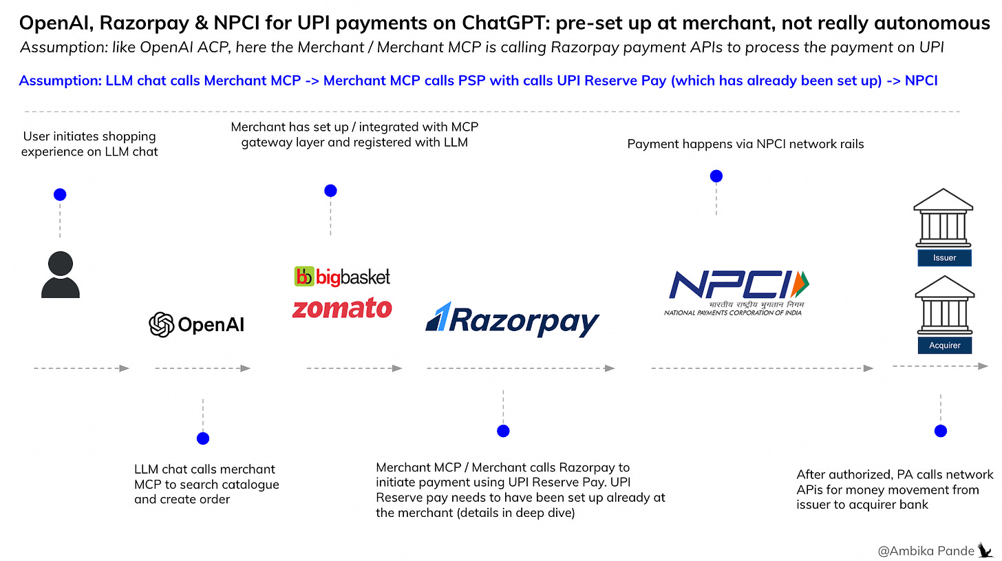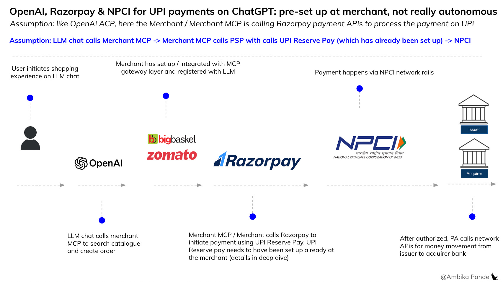 Note: Think of MCP as a translator layer, it allows the LLM chat to call the 3rd party APIs seamlessly. Once a 3rd party has integrated with the MCP, it has to register with the LLM, so the LLMs know what to call, to initiate any action on the merchant. And, there will be 2 layers of MCP. If we decouple the experience into shopping and payments, shopping will require the merchant MCP for catalogue access. But payments will require the merchant x PA MCP (assume Razorpay, Cashfree). I’m assuming the MCP here will be merchant specific, but PA hosted, since the PA will be processing the payment.