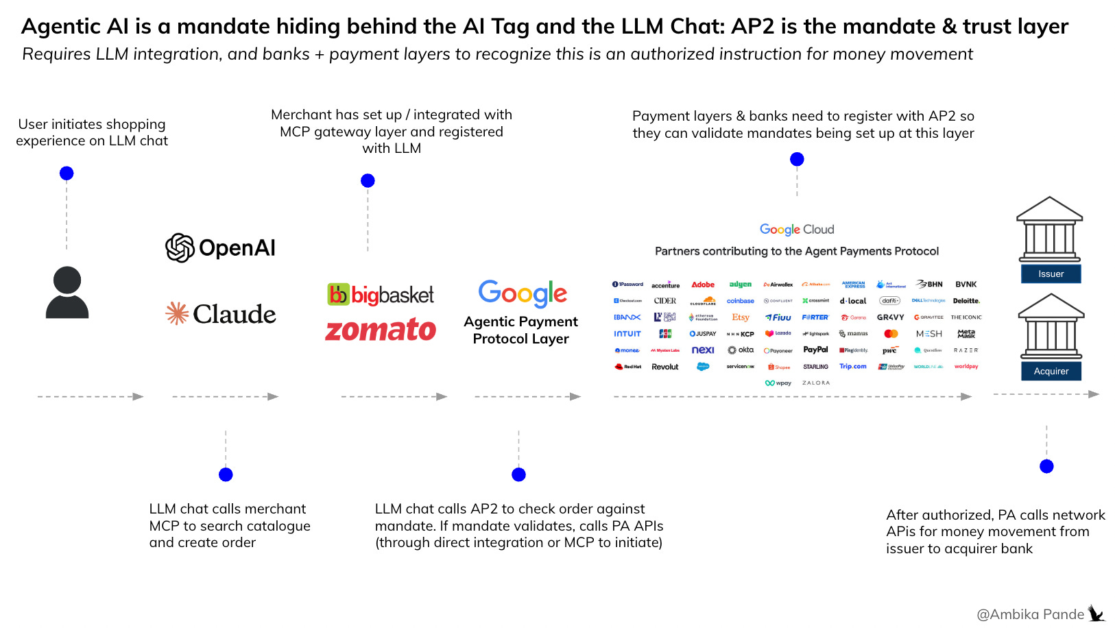 ➡️ User sets Intent Mandate which is stored in AP2 (this is the mandate set up + auth layer) ➡️ At the time of shopping, the LLM/Agent receives instruction, this could be chatGPT, Claude etc. ➡️ The LLM chat sends the instruction to AP2 ➡️ AP2 validates instruction against Intent Mandate ➡️ A cart mandate is created for that specific transaction which references Intent Mandate ➡️ Payment Mandate created which references Cart Mandate ➡️ The payment instruction is sent to the payment Aggregator / PA which is then sent to the Issuer Bank (which uses the creds / some sort of token I assume from the payment mandate to verify that this is a verified mandate) ➡️ Payment executed ➡️ Confirmation sent to AP2 to LLM and to the User