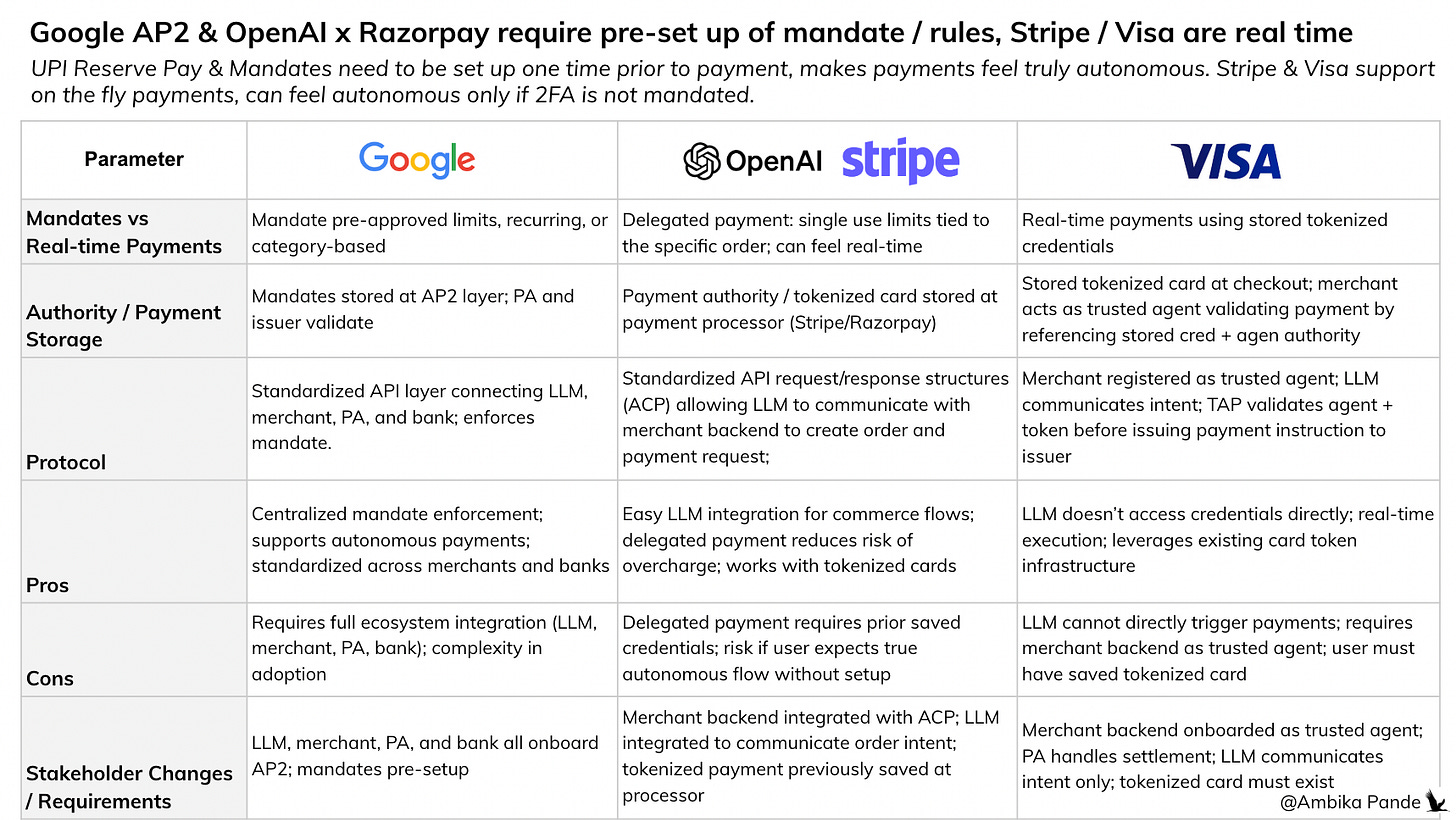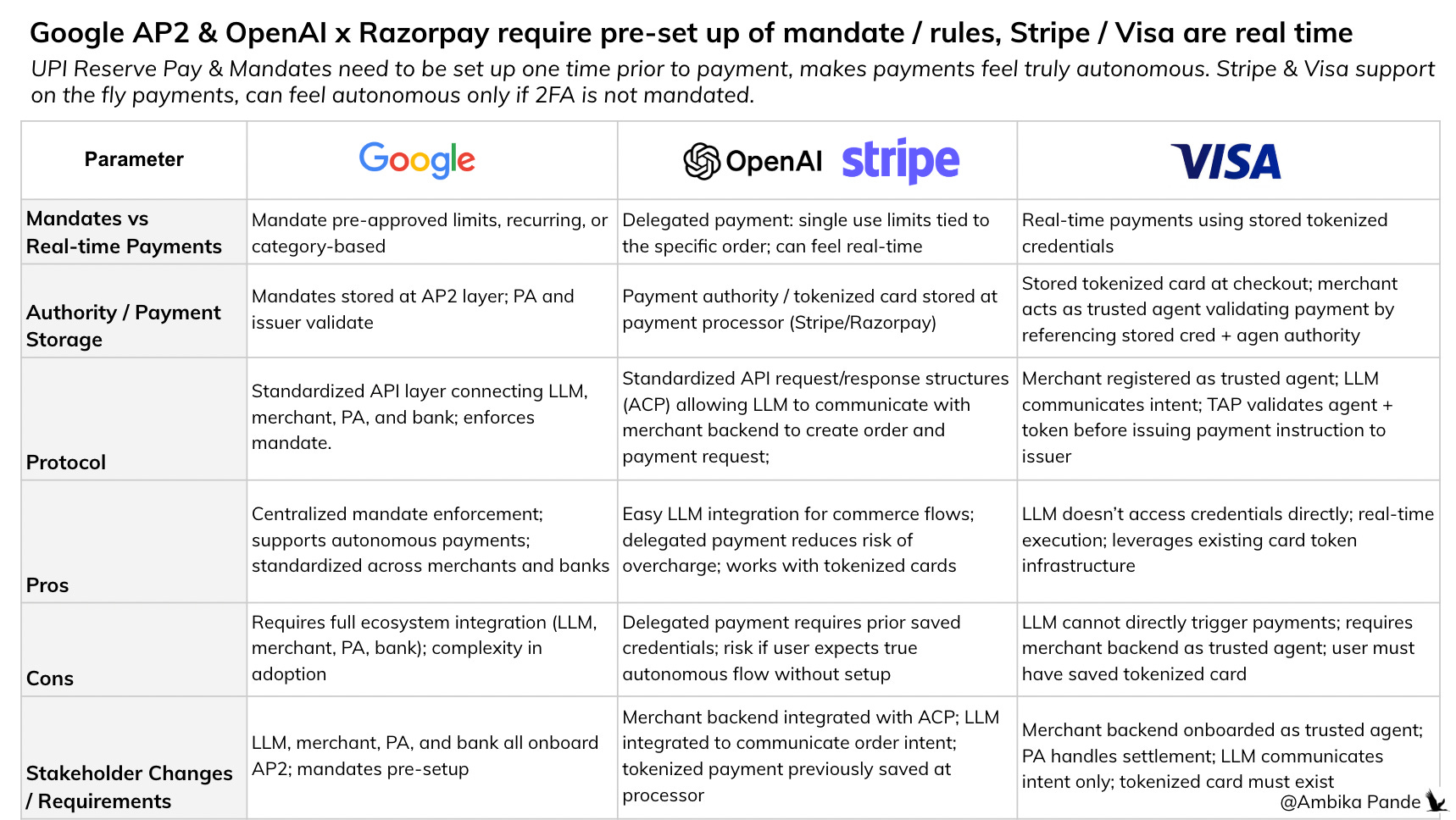 ✅ Takeaways: AP2 introduces a new “trust layer” that existing payment systems must natively recognize as equivalent to direct user authentication, and thus the requirement for existing systems to recognize this. Unlike the OpenAI x Razorpay integration, which is a payment block set up and authenticated at the merchant, AP2 is a separate layer that stores the mandate, and in real time the payment request is mapped against the AP2 stored mandate. But all stakeholders have to be integrated with AP2, and recognize it as an authority