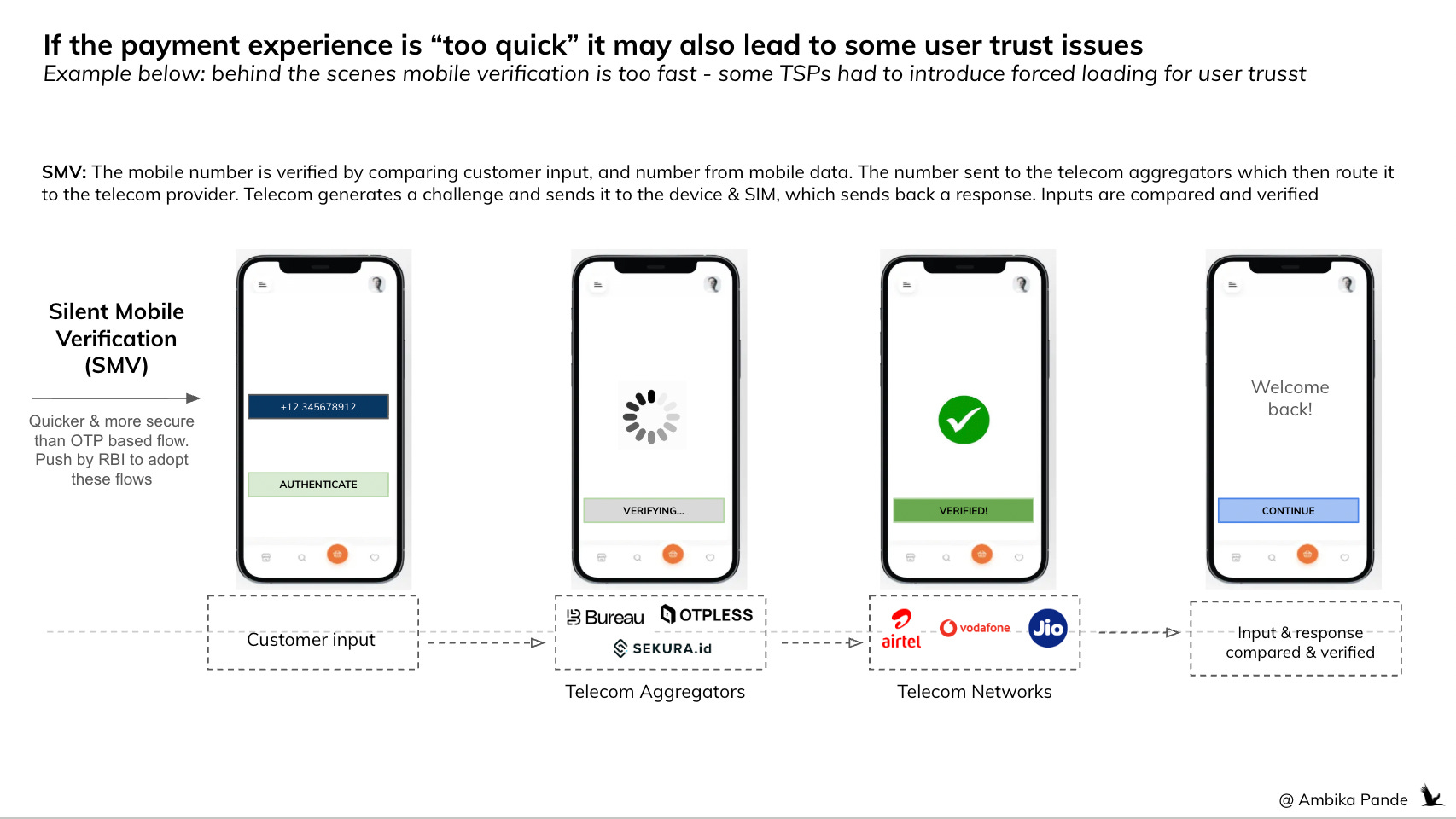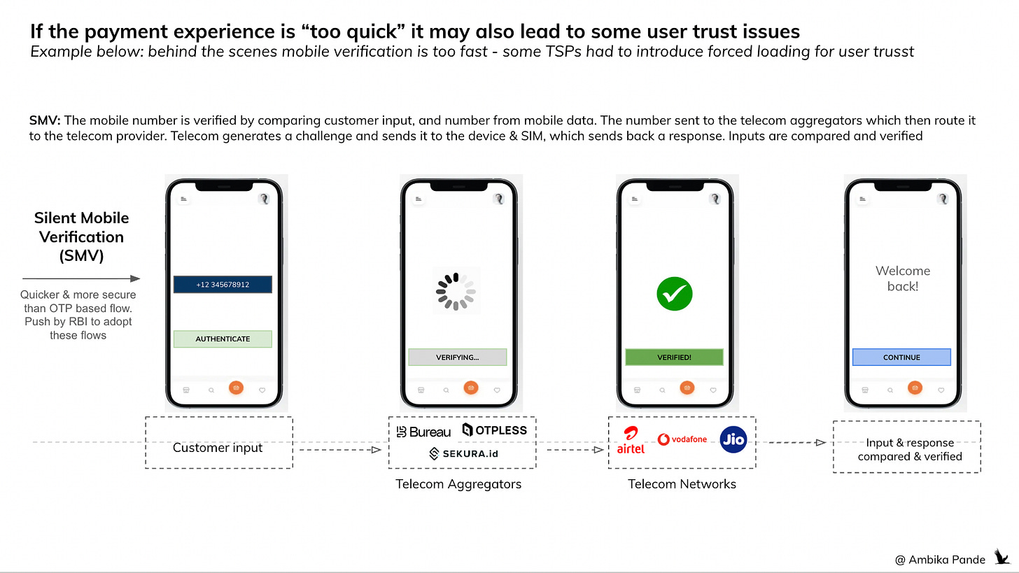 I remember speaking to a certain TSP that specialized in phone number authentication. And one of the tools that it provides are APIs for silent mobile verification. Which essentially allow user verification through APIs at the backend, instead of OTP verification. What I understand was, that the process is so seamless, that it had a negative experience on the users, where the user felt that the TSP was not doing rigorous enough checks. Finally the TSP actually had to add a few seconds of buffer at the time of log-in, so that the user was not taken aback at how seamless it is. And that is just for log-in.