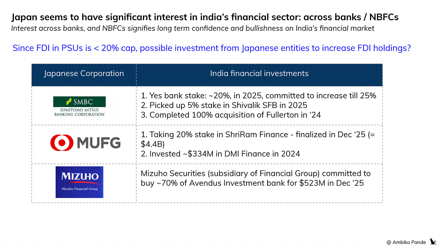 SEA and MENA is obviously of interest as well, but Thailand, Vietnam, Malaysia etc are still 5-10 years behind India in terms of fintech innovation, although favourable policies, especially around neobanks, and movement in the open banking space in this region suggests that this space is going to grow fast. An example of some financial investors driven by Japanese companies is below: SMDC, MUFG, and Mizuho are the key players, taking stakes in multiple financial entities in India.