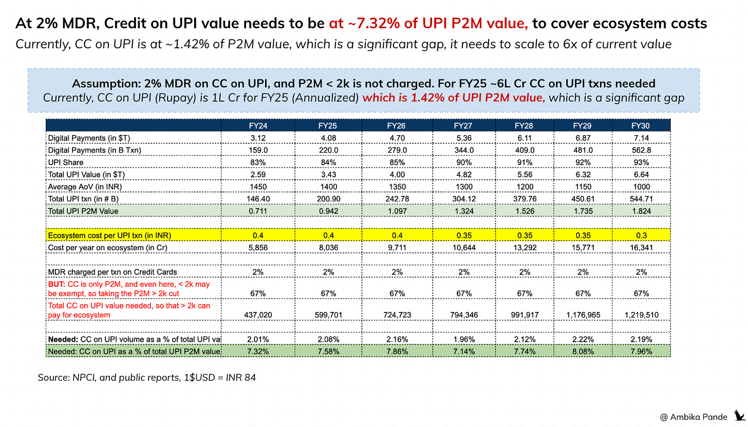 👇 I ran numbers on how much Credit on UPI (cards and lines) needs to scale to pay for the free UPI (on savings accounts) mandate. The numbers: