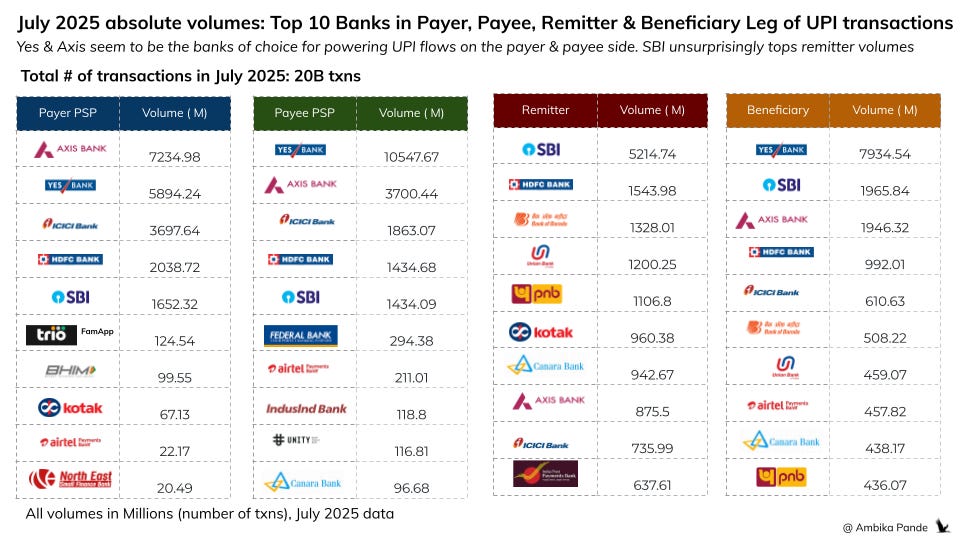 Eventually, banks, where core flows happen (UPI, AA) put their hands up: “Things may be free, but we have infra costs. You pay.” This is what happened with ICICI in July 2025 (and likely Yes Bank, Axis Bank the banks powering most UPI transactions).