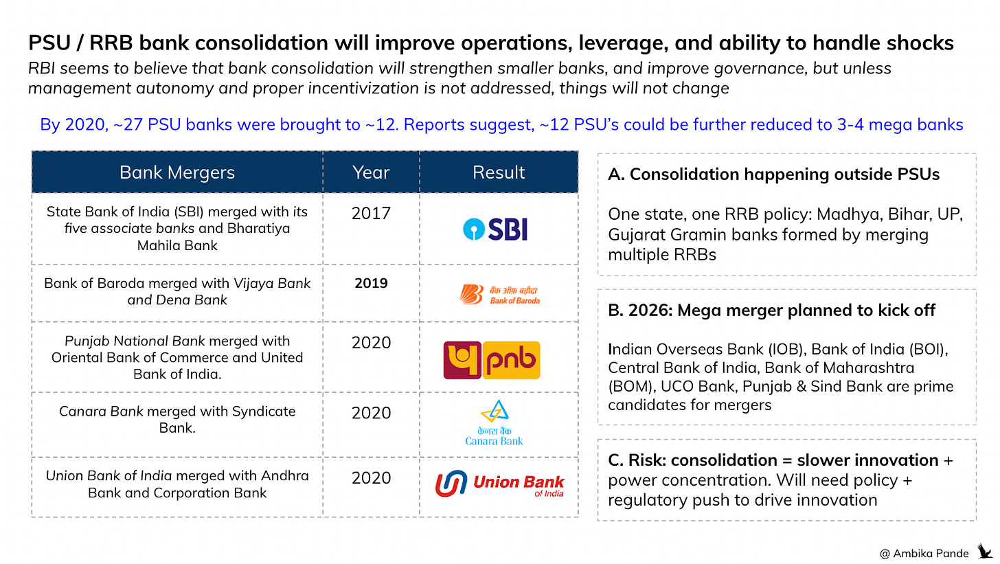 RBI wants to consolidate smaller PSU and RRB banks to improve scale, strength, and governance. Phase one completed ~2020: PSUs reduced from 27 to 12. Major mergers included SBI with its 5 associate banks and Bharatiya Mahila Bank; Bank of Baroda with Vijaya and Dena Bank; and similar consolidations at Canara, PNB, and Union Bank.