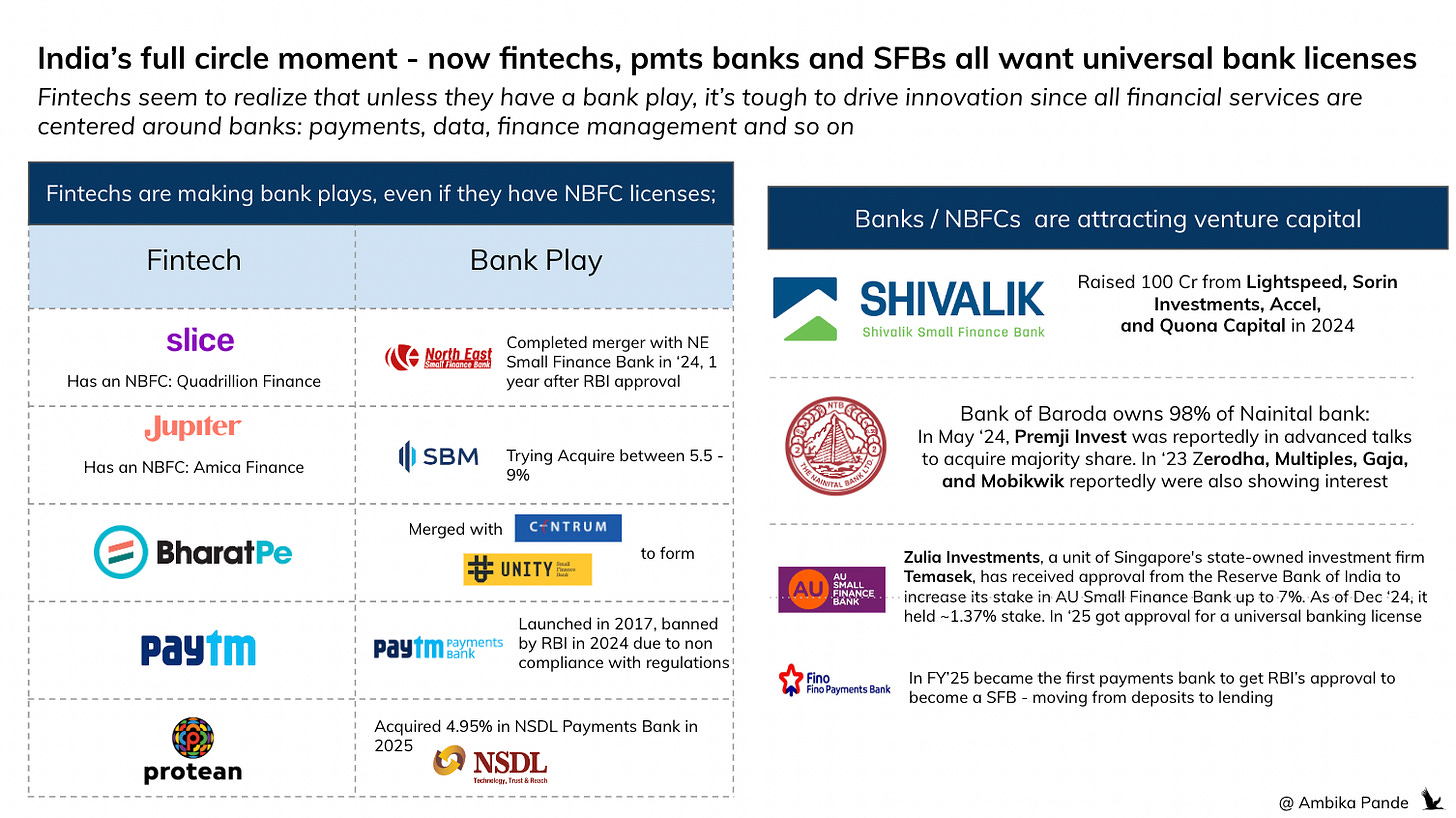 This tracks with a broader trend: fintechs going after banks through mergers and acquisitions. Slice merged with North East Small Finance Bank to form Slice SFB (Dec ‘24). BharatPe and Centrum formed Unity SFB. Paytm was a payments bank until it got banned, I expect it to revive once it pays its regulatory dues.