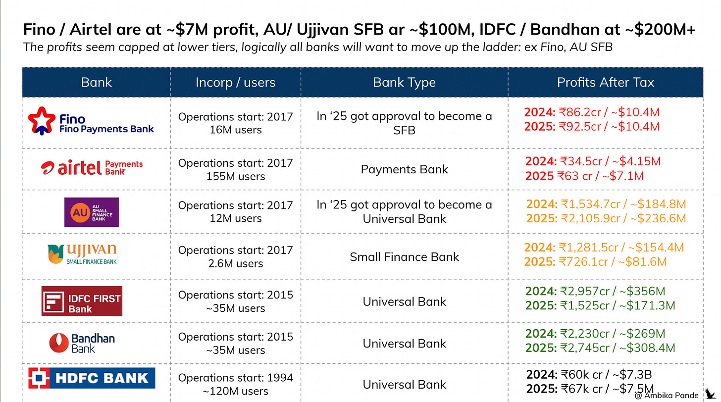 Both these timelines coincide with ~5 years of operations as a SFB, and in the case of Slice, from the date it rebranded. So clearly both of these are going for the universal bank play, and will try to become the “neobank” model that India sorely lacks today. And maybe that is why there is also a lot of investment interest around your small finance banks - Shivalik SF bank for example, raised funds from investors that include Accel and Lightspeed. I assume the vision here is for it to turn into a universal bank, in light of the profit limitation on SFBs. I expect this to continue to happen for SFBs, especially those with serious investment raised - all eyes on SFBs such as Jana, Suryoday (RBI approved 1729 Capital - an FPI, to acquire upto 9.99% stake in it in December ‘25) , Equitas SFB and so on.