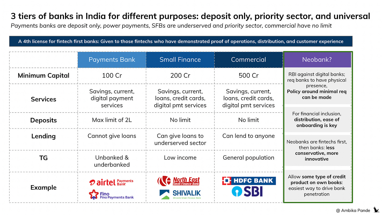 To solve for different types of products that require banking flows (payments, deposit only, credit) is why India introduced tiers of banks