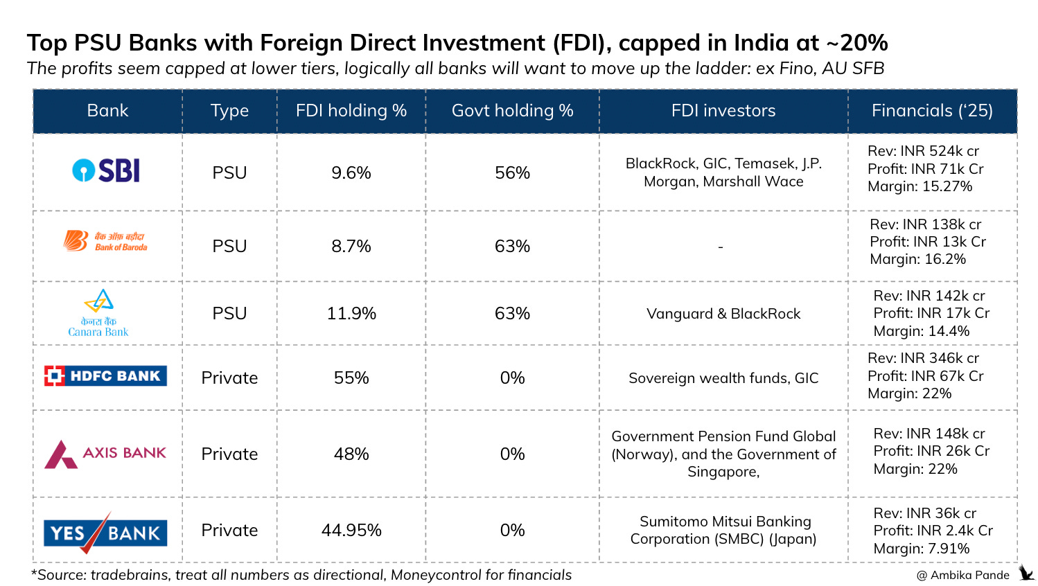There has been market speculation and government consideration of raising the FDI limit for PSU banks to 49% to attract more capital, but the official limit remains 20%. In fact, we’ve seen a sharp drop in the market share of PSU banks ever since the government came out and clarified that right now there are no plans to increase this to 49%. So clearly, the view in the market is that increasing this limit to 49% somewhere will help. Whether that really is the case or not is anyone’s guess. In private banks, while the cap is 74%, most don’t exceed 55%. In fact, in the case of Yes Bank, and Axis bank, the FDI is ~45 - 48%, well below the 74% cap. But the point is, that there needs to be atleast 40-50% ownership allowed.