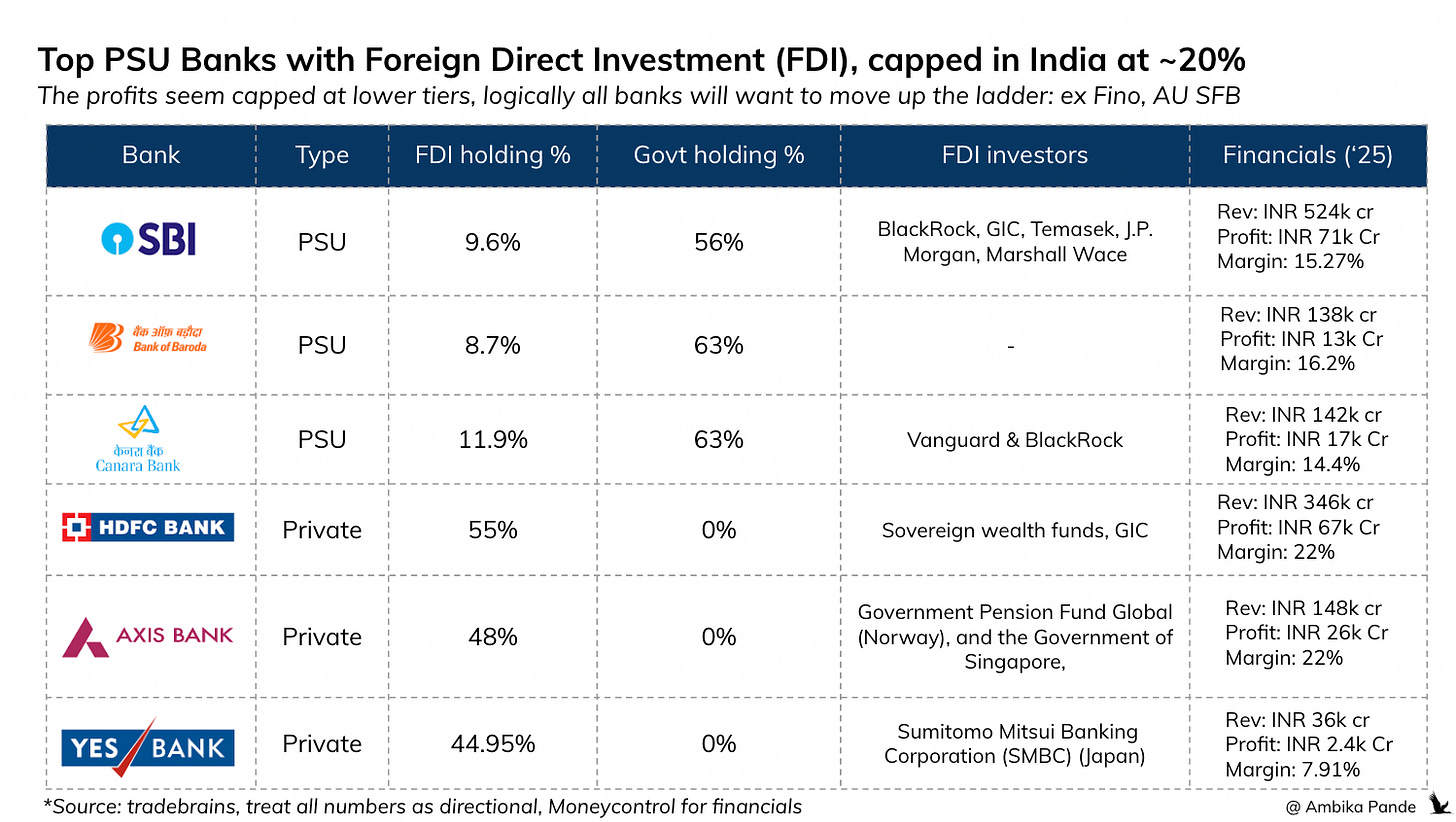Now, while minority foreign investment brings capital, market discipline, and global best practices, FDI investors care primarily about profits and dividends, not really day to day control. The government retains majority ownership and voting rights, protecting policy objectives. PSU banks, being backed by the state, are less likely to fail, making minority FDI a low risk tool to encourage transparency and governance improvements. And all this is fine: but taking a stake without having atleast veto rights is a bit concerning to any investor worth their salt.