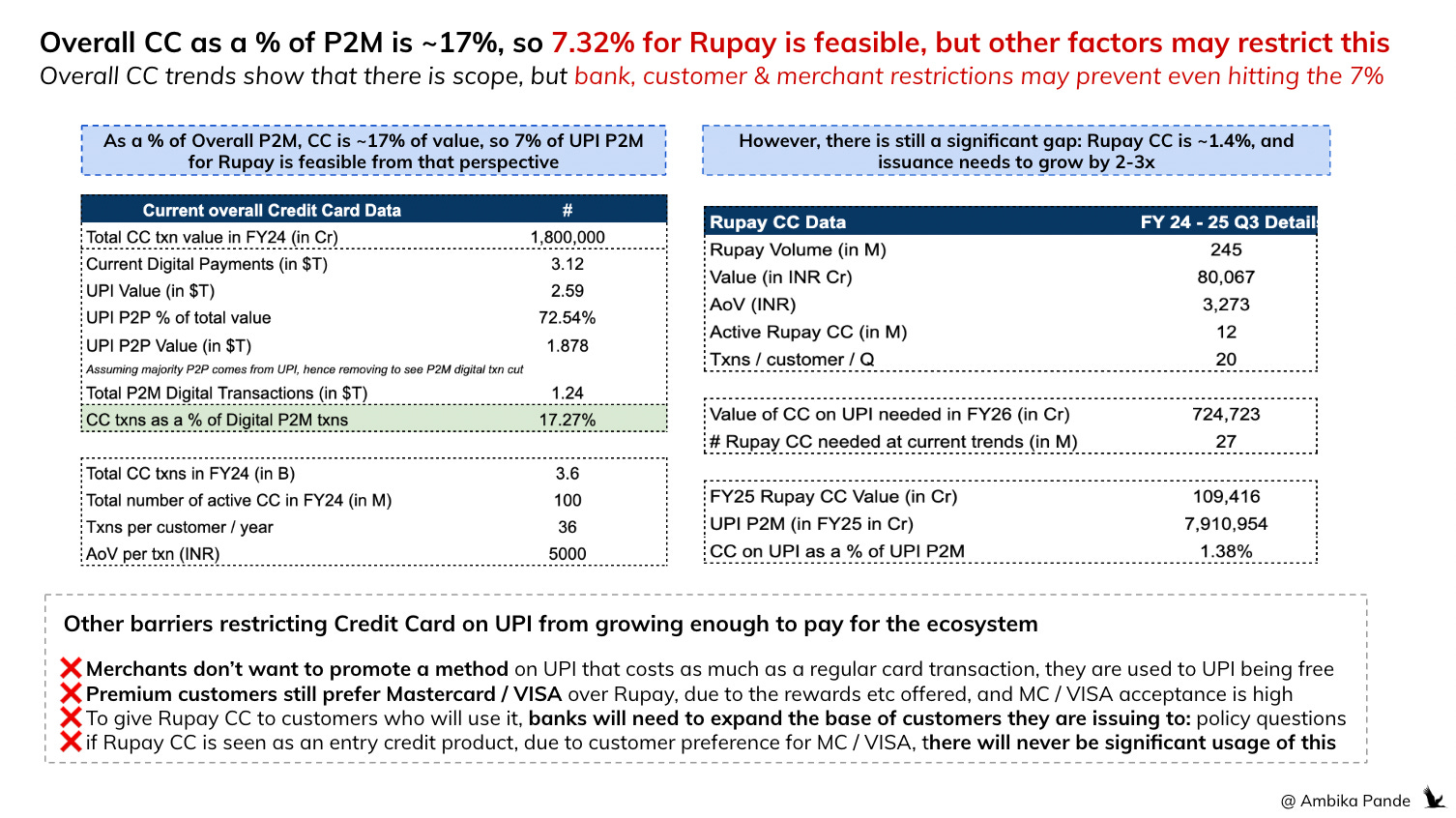 Overall, when I look at credit card volumes in India, and CC as a % of total P2M transactions, this is around 17%. So targeting a 7.32% for Rupay + Credit Lines on UPI is feasible theoretically. What will impact this is merchant and customer adoption, although with recent Credit Card launches by PhonePe and Gpay for Rupay on UPI, may signify that this is ready for takeoff. But only time will tell, and this is not time that fintechs may have.