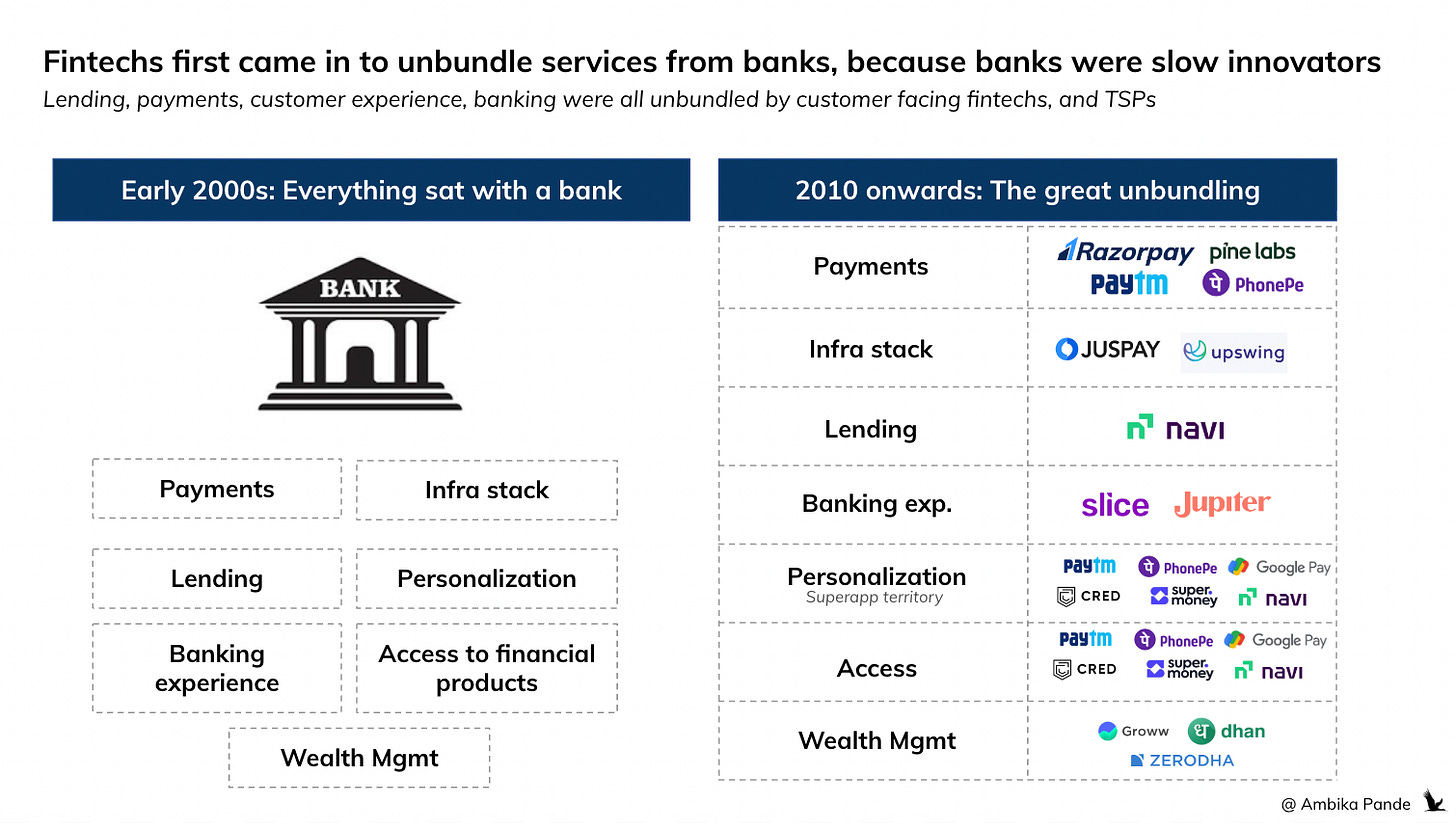 Fintechs entered the market with a clear value proposition: banks weren’t providing optimal customer experience. “We’ll be the middlemen, optimize everything, and get your work done.” The market scaled, fintechs raised capital, and did a solid job redefining what financial offerings should look like:
