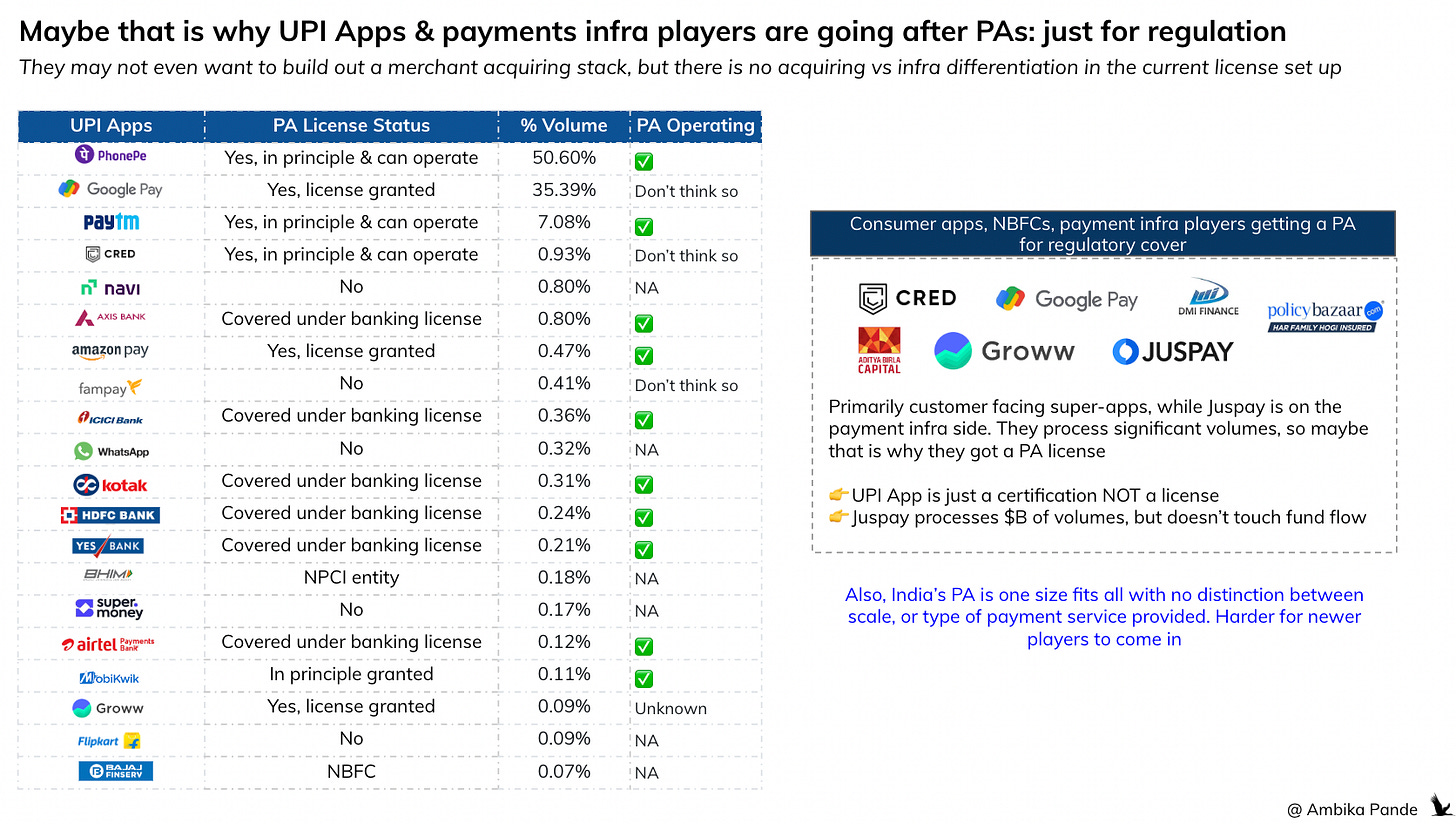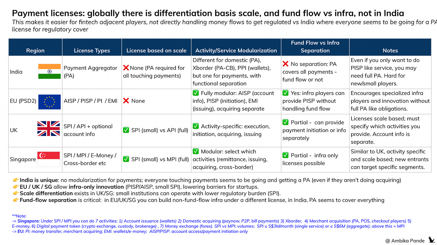 There is no license separation between infra and actual fund flow, which results in everyone going after the same umbrella PA license in India, despite having no play in money movement. Example: even if you are NOT involved in fund flow, but just in payment initiation (think, a payment orchestrator, or even a UPI app), you would still need to probably get a PA license