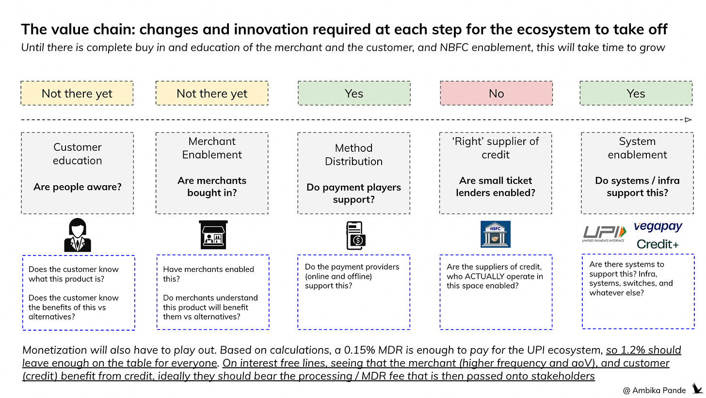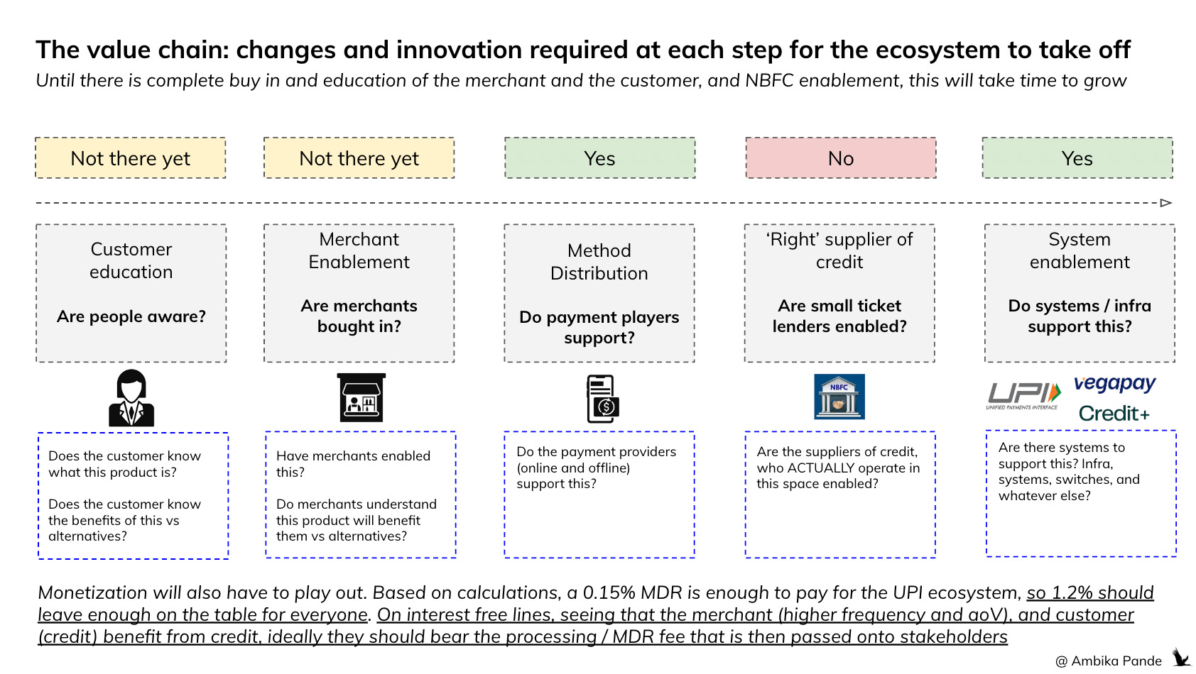 By the looks of this, it seems like the ecosystem infra is ready to take off. What is missing are key levers to enable this, which are customer awareness, the merchant narrative (which are getting there to be fair). The key unlock will be NBFC enablement, and once that takes off, I see customer awareness going up as well.