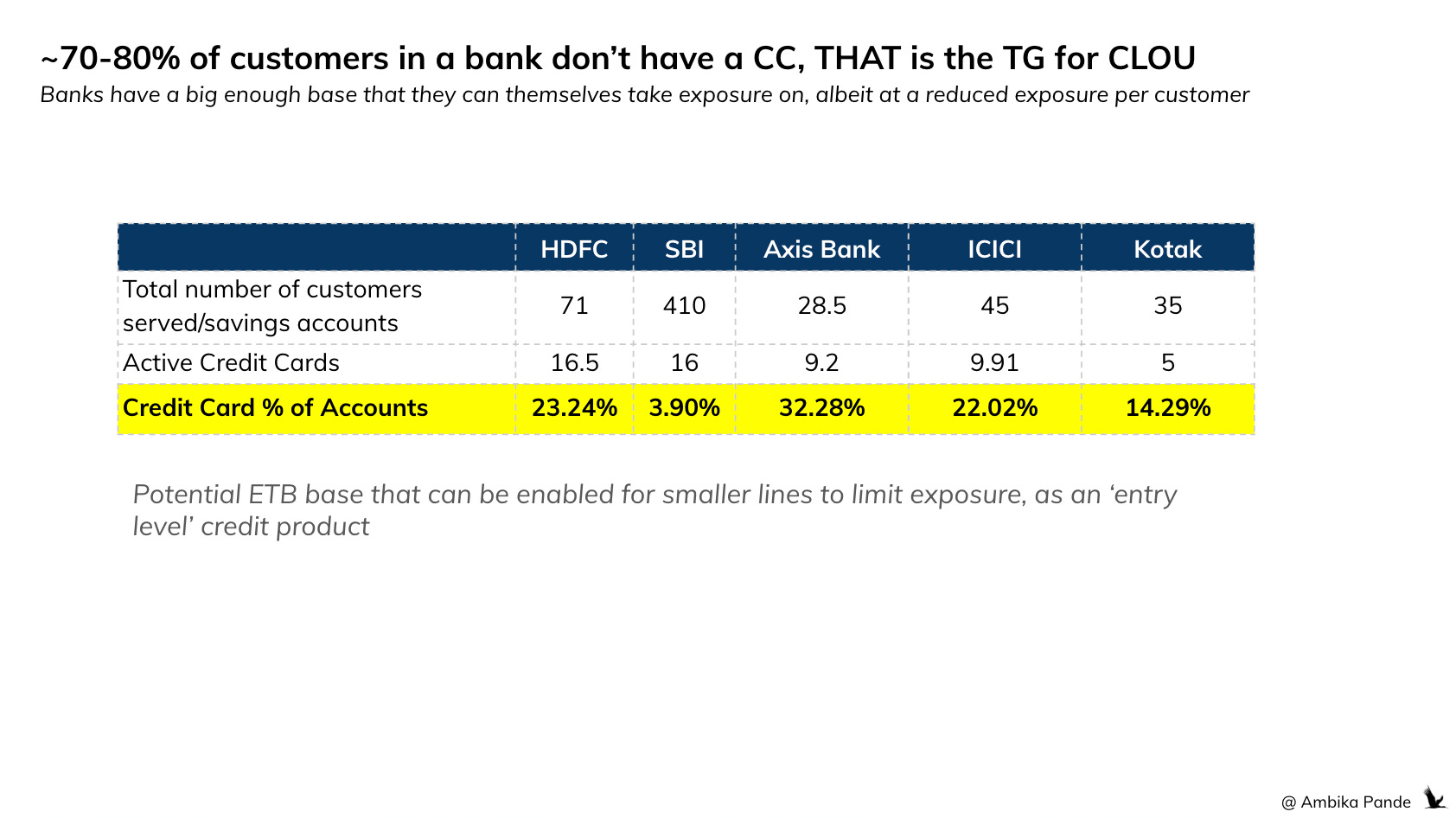 CLOU also solves a long-standing gap in Indian lending: profitable, compliant small-ticket credit. Unlike BNPL, which RBI mandated must follow credit-card-like guidelines if interest-free, CLOU products are structured cleanly as OD, EMI, or card-equivalent products from day one, avoiding post-facto compliance risk. Importantly, CLOU is emerging as a large scale NTB (new to bank) and NTC (new to credit) acquisition engine. Banks are acquiring customers at very low marginal cost while remaining profitable, something that card programs increasingly struggle to achieve.