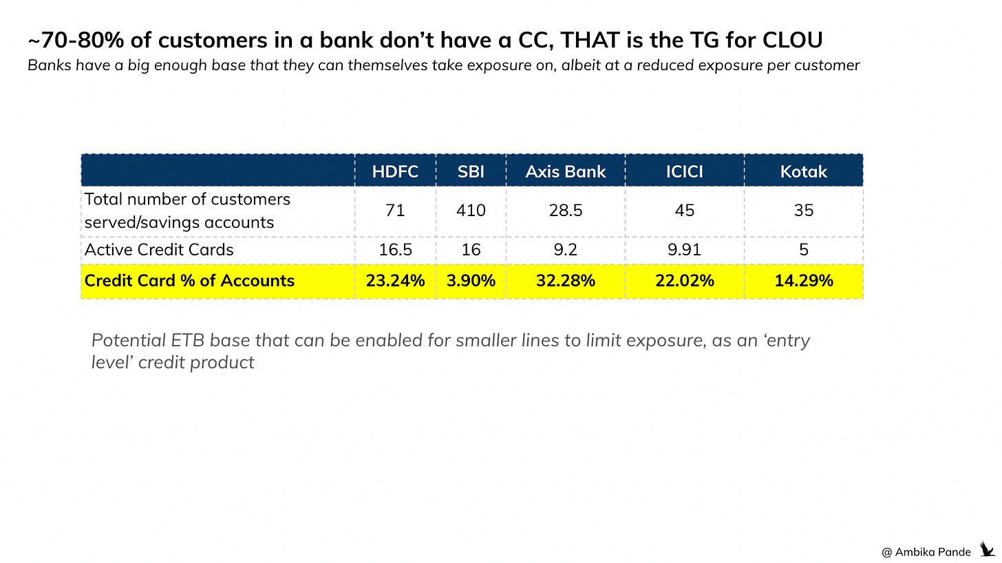 It solves for ‘experience’ because it is a product that is marketed towards the ETB (Existing to Bank base). Let’s break down the bank customer base shall we? In any bank, 10 - 20% of the creme de la creme customers are the ones that get a credit card. There are still ~80-90% of customers who have a bank account, and probably half of this who are credit worthy. So the whole “additional effort” and the ‘friction’ that exists in user onboarding journeys for NTB (new to bank) customers goes away, since this already a customer known to the bank. I equate this to a flow that is similar to a customer using their mobile number to avail of offers, here I assume there would be a PAN entry step as well.