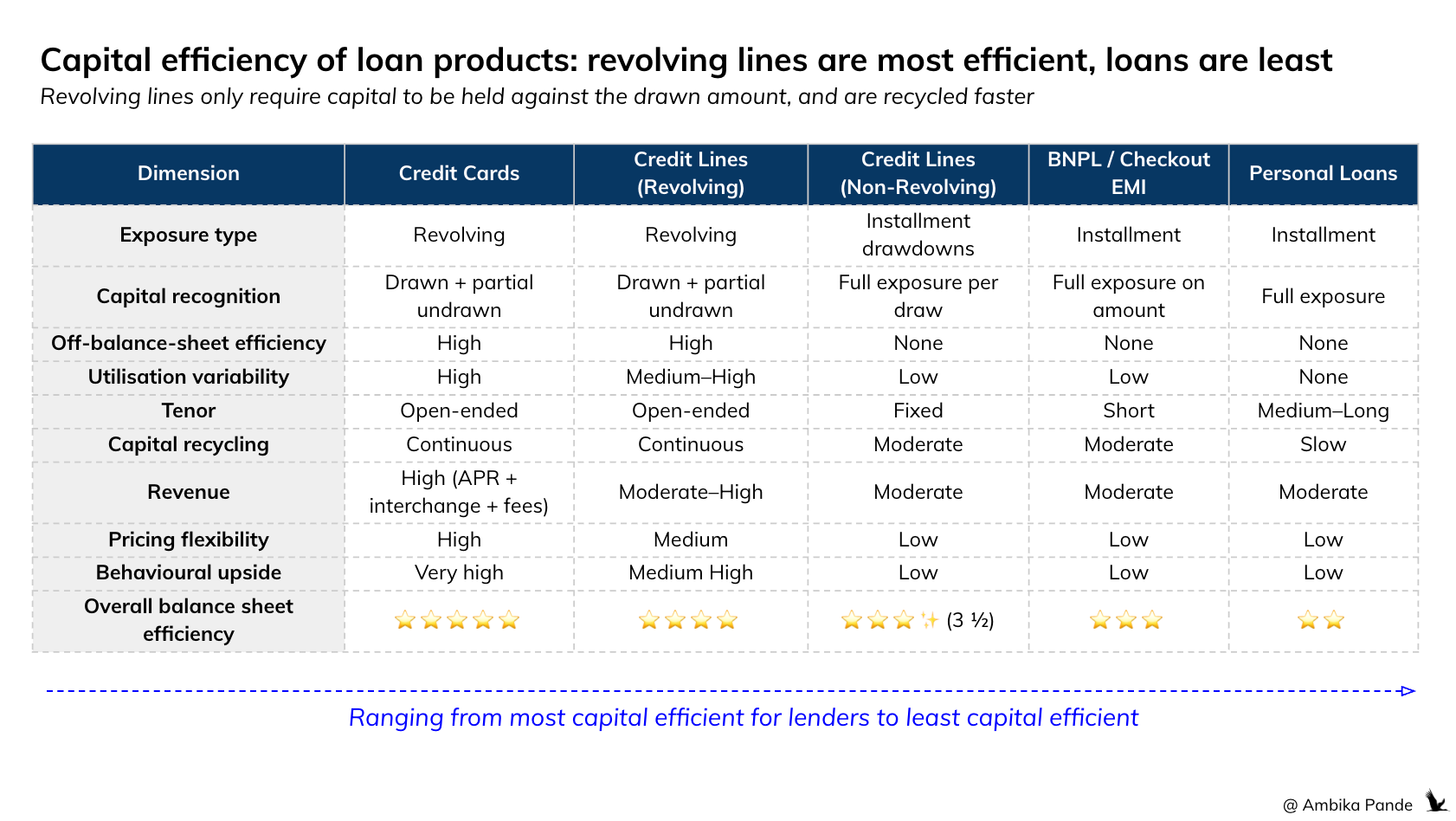 Capital recognition: When and how much of a credit exposure gets counted toward risk weight assets, which determines how much regulatory capital the lender must hold. Credit Cards are super efficient here, since the lender holds capital of the ‘drawn limit’ and a % of the ‘undrawn limit.’ Example: The user’s limit is INR 100. The user has utilized INR 60. Capital is held against this INR 60, and some % is held on the balance INR 40, which is usually 20-25% (called CCF or credit conversion factor). Credit Cards are efficient since capital is not held against the whole INR 100. Loans are very inefficient, since capital has to be held against the entire disbursed amount. Revolving credit lines are closer to credit cards, while non revolving credit lines are closer to loans with 1 key difference: the capital buffer ideally should be taken against the ‘drawn amount,’ not the total sanctioned amount.