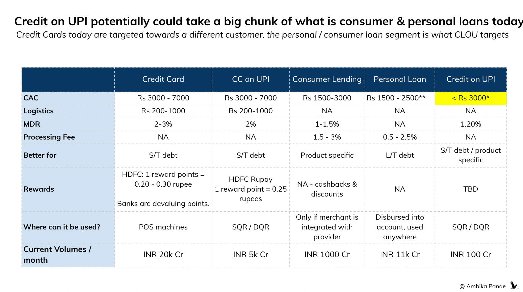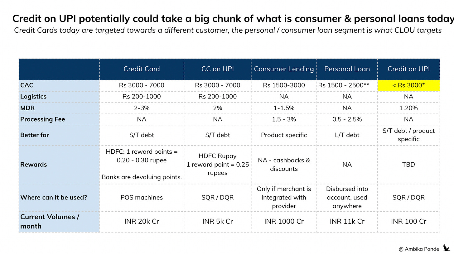 As a product, it is primarily built to target not the top 20% of customers, which are being served by a Credit Card (Mastercard, Visa, maybe Rupay), but the middle, which don’t have access to a credit card yet, but want some sort of credit account that they can use seamlessly and wherever they spend. Right now, those customers shop using consumer loans, or take personal loans, and then use that for their expenses. THAT is the base that CLOU is targeting. Again, very high level numbers, but the personal loan market in India is INR 11k Cr. And just in terms of fintech lenders (I’m not counting players like Bajaj Finance etc that are present in offline stores), the consumer loan market is INR 1k Cr. These are big numbers that Credit on UPI has the potential to tap into.