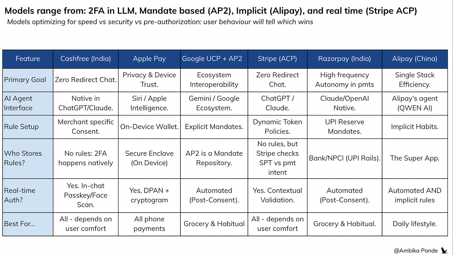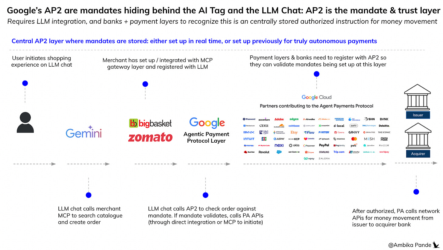 The good thing about AP2 is that it is an open standard, so anyone can onboard, and then use it across entities. It isn’t like Stripe’s ACP, which can only be used on Stripe. The problem here though is the same: EVERYONE in this chain has to be onboarded on AP2. If even one isn’t, then it fails. And of course, the same mandate issue: For the user to go and set up mandates per merchant or category can get tedious.