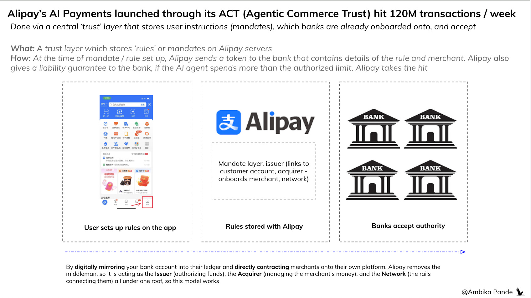 So, Alipay has all 3. Issuer bank authorization to move money. Check ✅ Acquirer bank authorization to accept payments. Check. ✅ And, a massive scale of merchants and customers to be able to execute this at scale (80M merchants, ~1B users - this seems high, but is what is publicly reported. I’d still peg this number at hundreds of million). Check. ✅ That is why Alipay’s AI pay hit ~120M weekly transactions in Feb 2026!