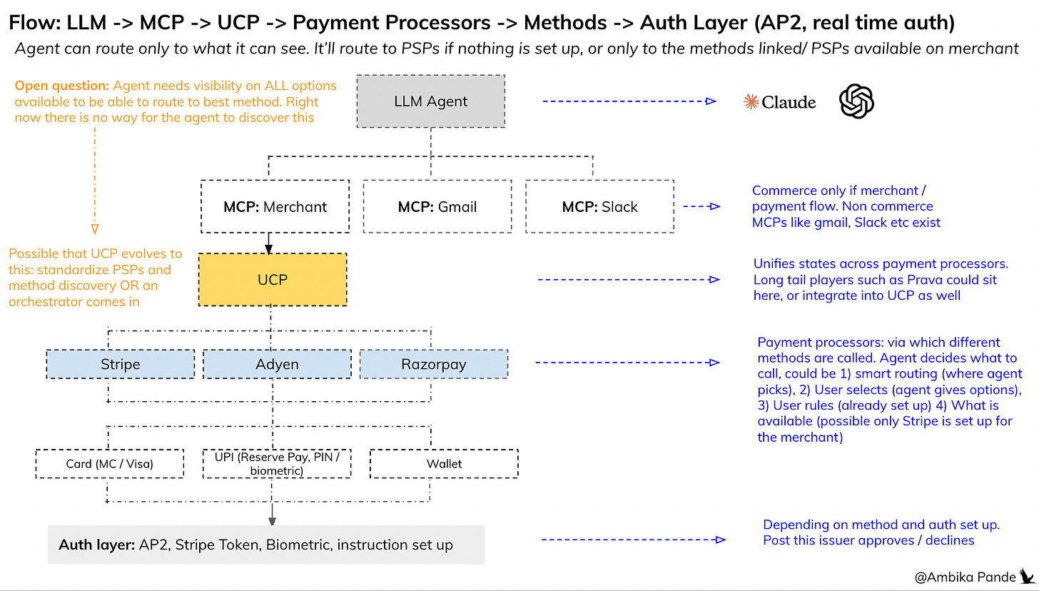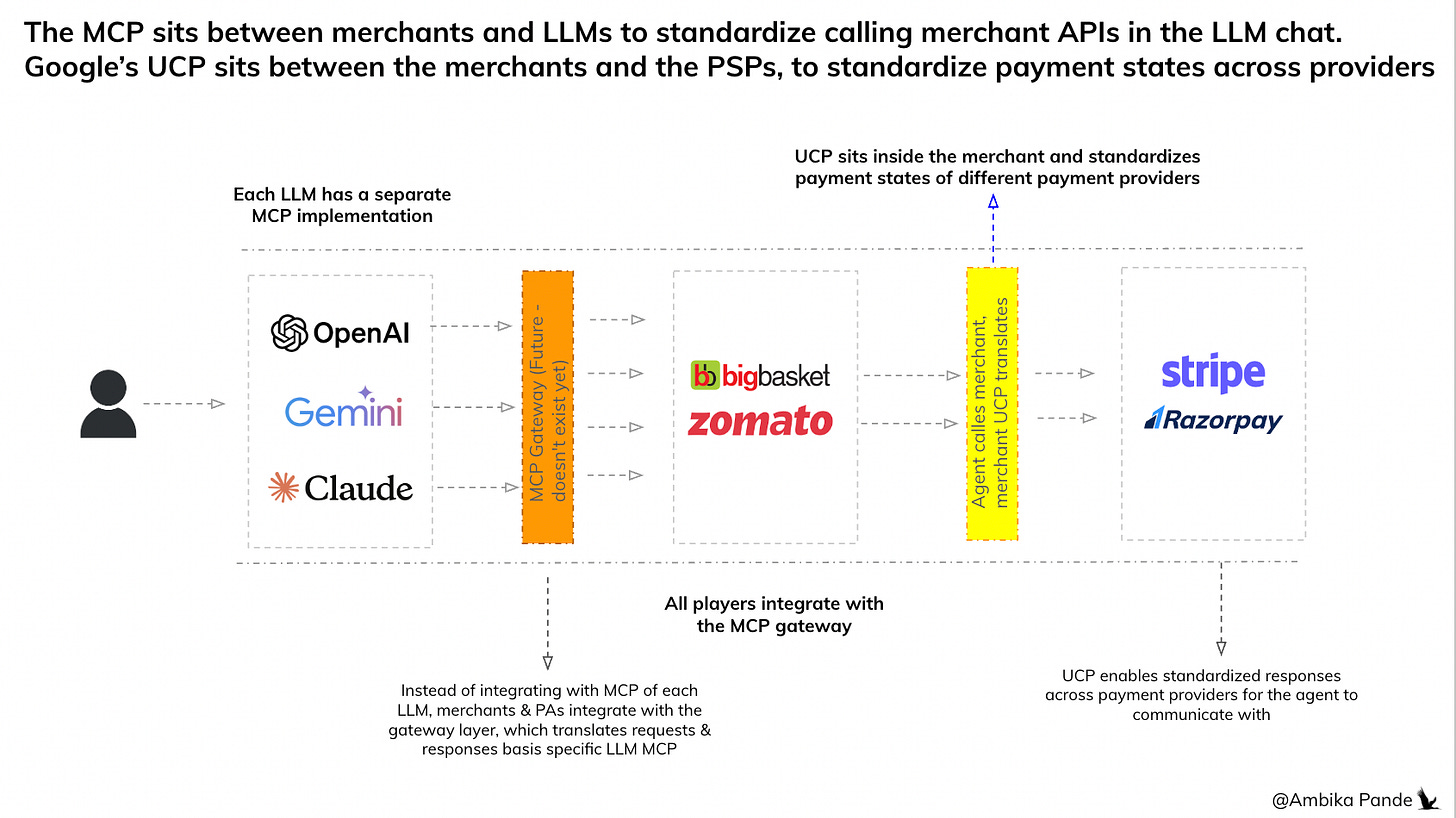 UCP → Still early days, but this will essentially be another protocol that stakeholders will have to be onboarded on. Merchants will have to build the UCP schema within the MCP (MCP is like the pipes, and UCP is the language: remember, it helps standardize payment states). The thing is, it is still very new, so it’ll take time to figure out what protocol is here to stay: the big players that will win are the one that have distribution for sure, but will it happen via the MCP (with UCP schema), or via MCP calling Payment APIs separately is something we will have to see play out.