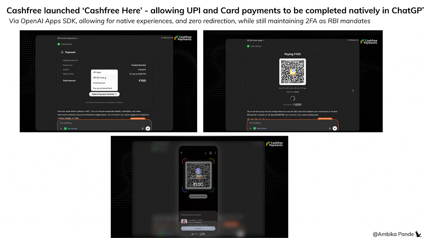 Cashfree demoed this at the AI summit in Feb 2026, with OpenAI with Swiggy and Mastercard, which allows for native biometric based passkey authentication within the LLM chat. This is exactly like a payment flow today, except the interface is the LLM chat and not the merchant or the payment app.