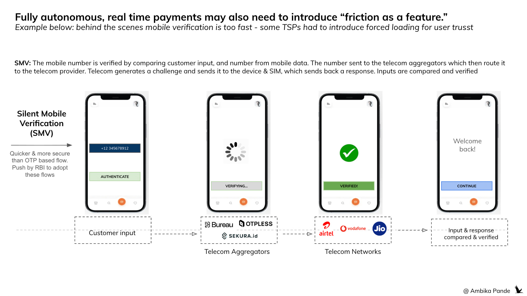 Also, anecdotally, having absolutely NO friction, is actually a problem in fintech flows, because this is sometimes perceived by the user as a flow that has inadequate risk checks. I’ll give you an example: With the “SMS less flows” that we are trying to implement, we use something called SMV - or silent mobile verification. All this essentially means is that we are using telecom APIs to verify the customer mobile number, instead of a manual SMS output. In a lot of cases, this happened in less than 1 second, but TSPs had to force-add 2-3 extra seconds, since they found the speed or the “lack of friction” decreased the user trust.