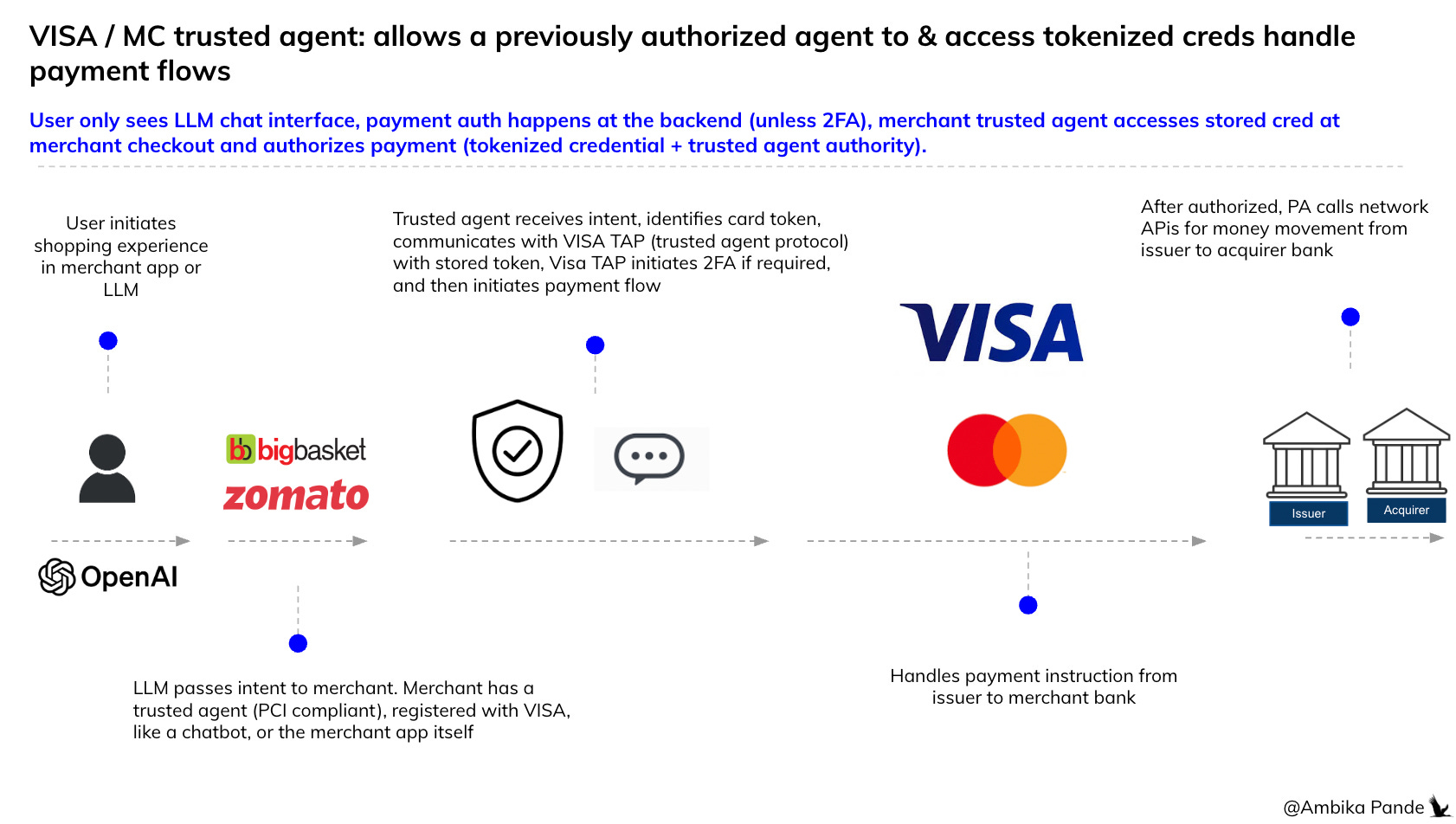 The Agent needs to be onboarded at a platform level on the payment providers: be it MC / VISA / Stripe or whoever. So a ChatGPT / Anthropic needs to be onboarded here, and a specific identity given to them so that stakeholders can check this is a verified agent.