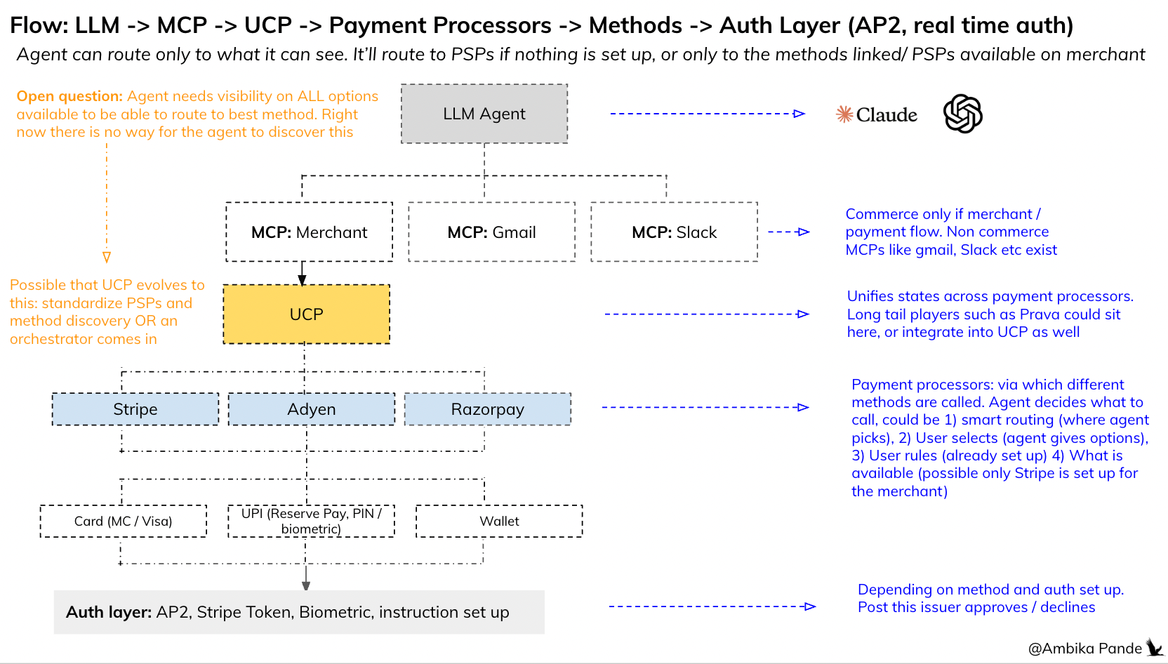 To understand where they will fit, let’s first look at the e2e flow. Now, putting together everything we’ve been talking about in the above sections. Essentially, the LLM agent calls the merchant MCP, which then calls the UCP to call payment APIs of PSPs. And then subsequent methods are called, depending on what is set up / available, and finally the auth layer comes in, which can be user driven, or using pre-set up mandates.