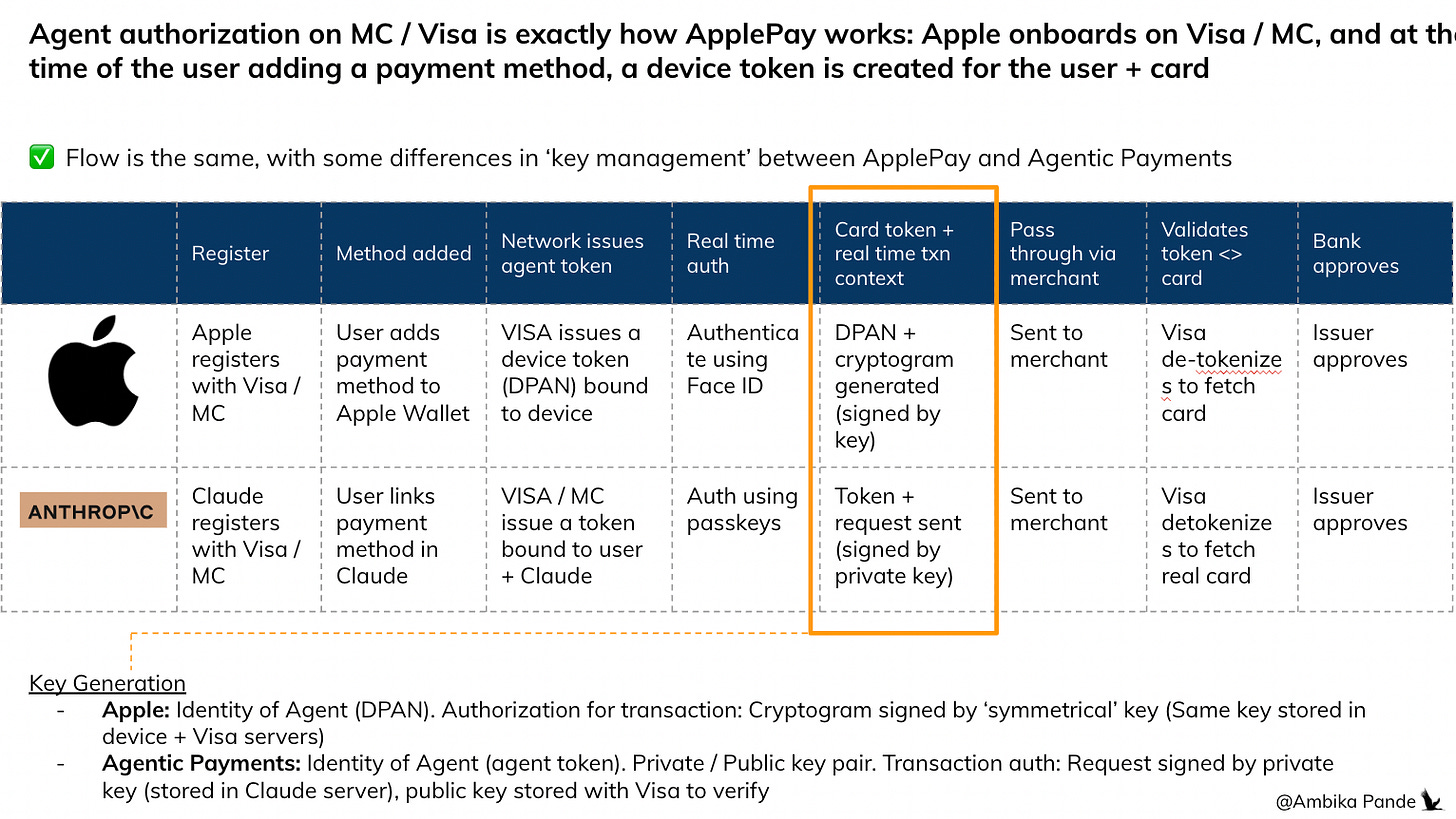 2️⃣ In the case of Apple, the same key is stored in the device and Visa, while in the case of agentic payments, there is a public private key pair.