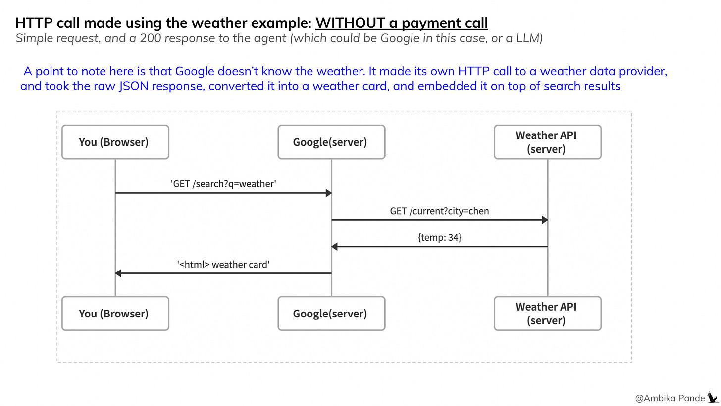 HTTP responses have multiple status codes. 200 means: “here you go.” 404 means doesn’t exist. 402 already existed, but no one ever used it until now, which essentially is the response code for “pay me first.” So, now, to explain this in an easier fashion, let me use the same example I used above: fetching the weather, and show it also in an agentic workflow.