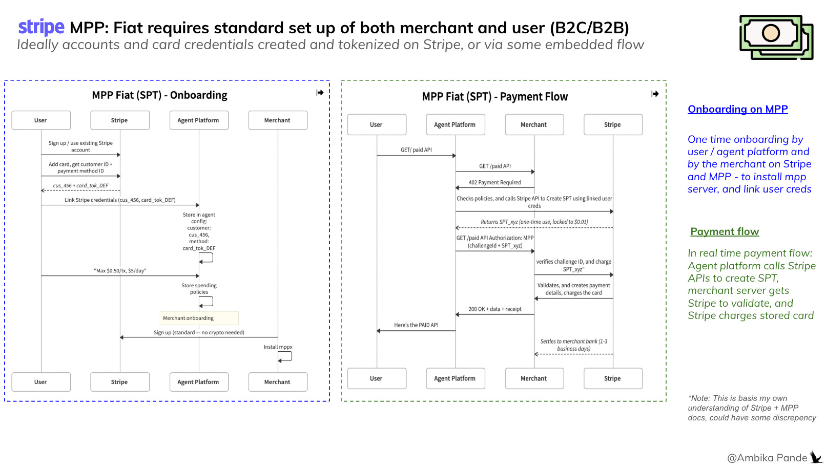 Now, x402 has seen scale (150M+ transactions), but it has been around for a year. MPP has just launched. The problem I have always had with blockchain transfers is the lack of regulation, dispute management, and a central authority who is actually imposing fraud and risk controls. That is being solved by MPP. So even though there is an “extra” entity here, and an extra step of onboarding / KYC etc, to create a Stripe account, and enable it - my view is, when you’re moving money, it is okay if there are a few extra steps. Friction is a feature here.