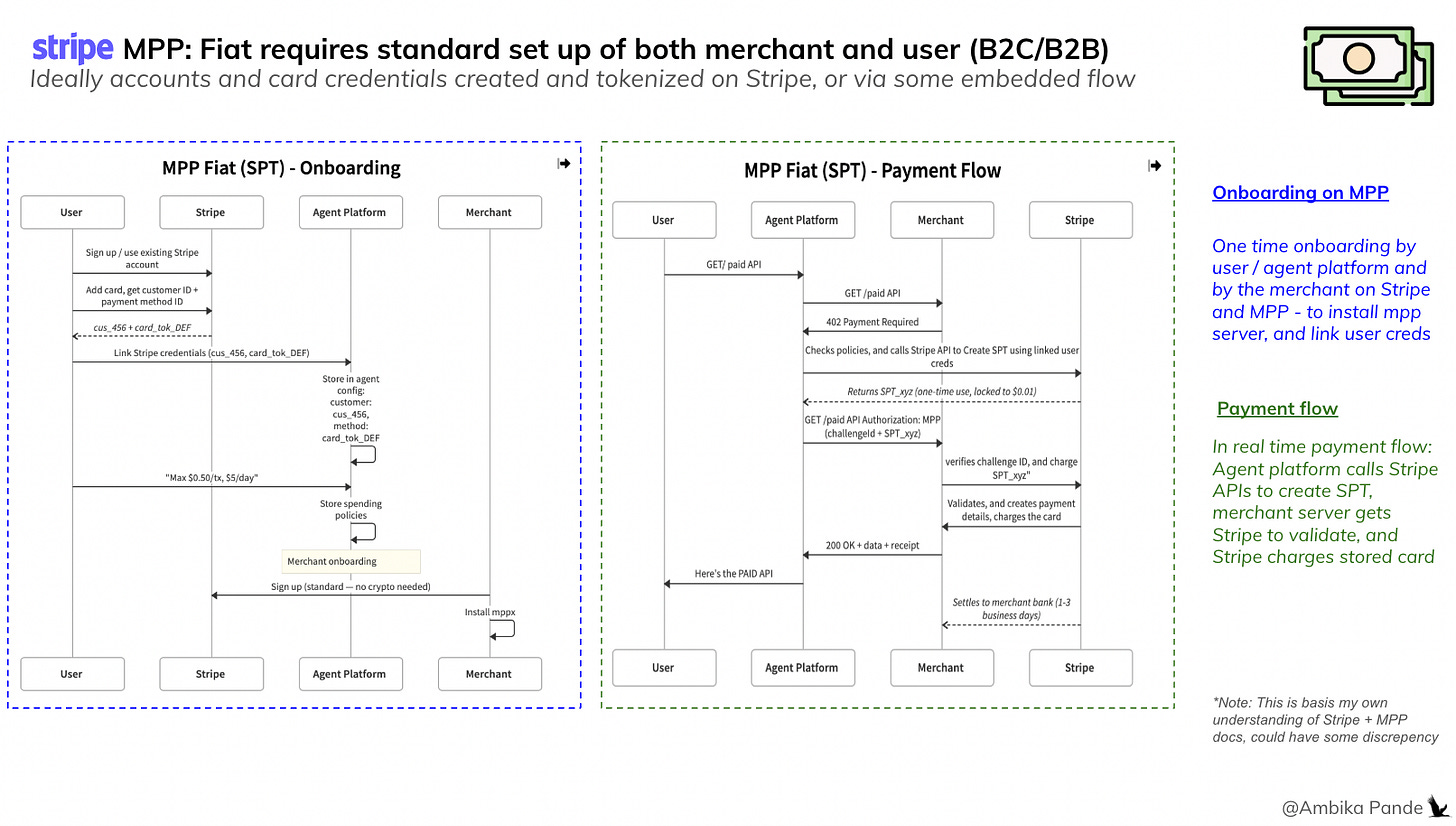 In MPP, if its crypto, then the merchant server calls Stripe APIs to return back the “crypto method” and the “merchant deposit address.” If it is fiat, then the agent calls Stripe APIs to create a SPT, and share with the merchant. In both cases, Stripe is being called in the middle.