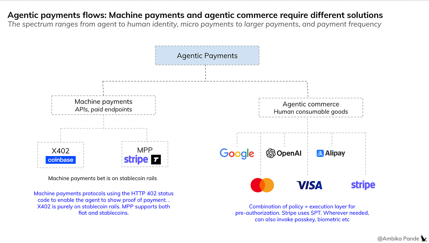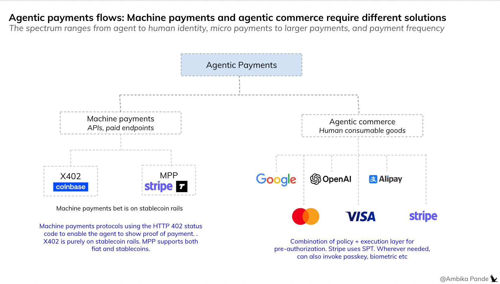 So, then, in this whole agentic payments flow, while everyone and their aunt is trying to launch their own protocols, it’s also important break agentic commerce into: agentic commerce payments, and machine payments.