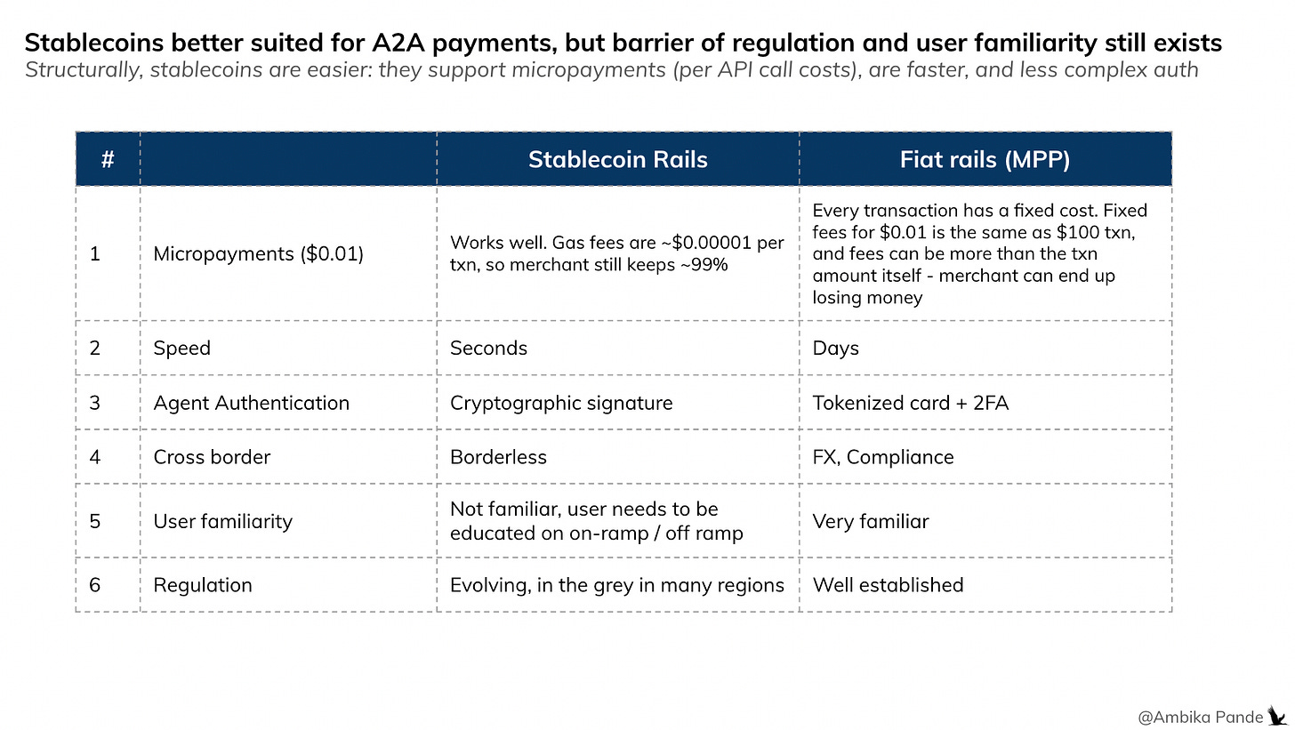 In agentic commerce, it could still be fiat: if we go by the thought process that transactions for human goods is (relatively) more occasional, and of a higher ticket size. In machine payments, when we are talking about things such as paid endpoints and so on, and transactions can go into hundreds or thousands per day, stablecoins just make more sense, not just from a “number of stakeholders” involved perspective, but from a cost perspective.