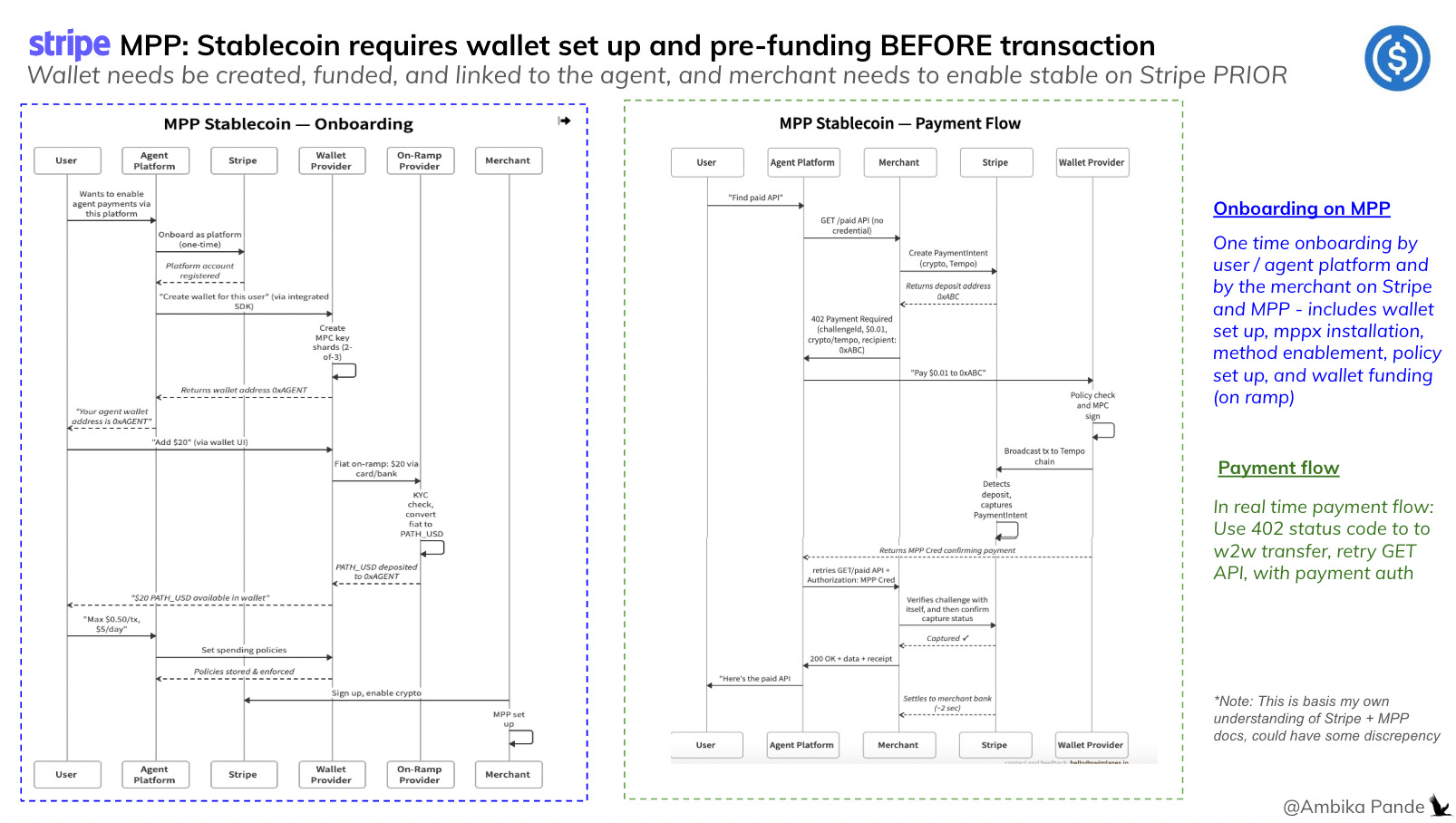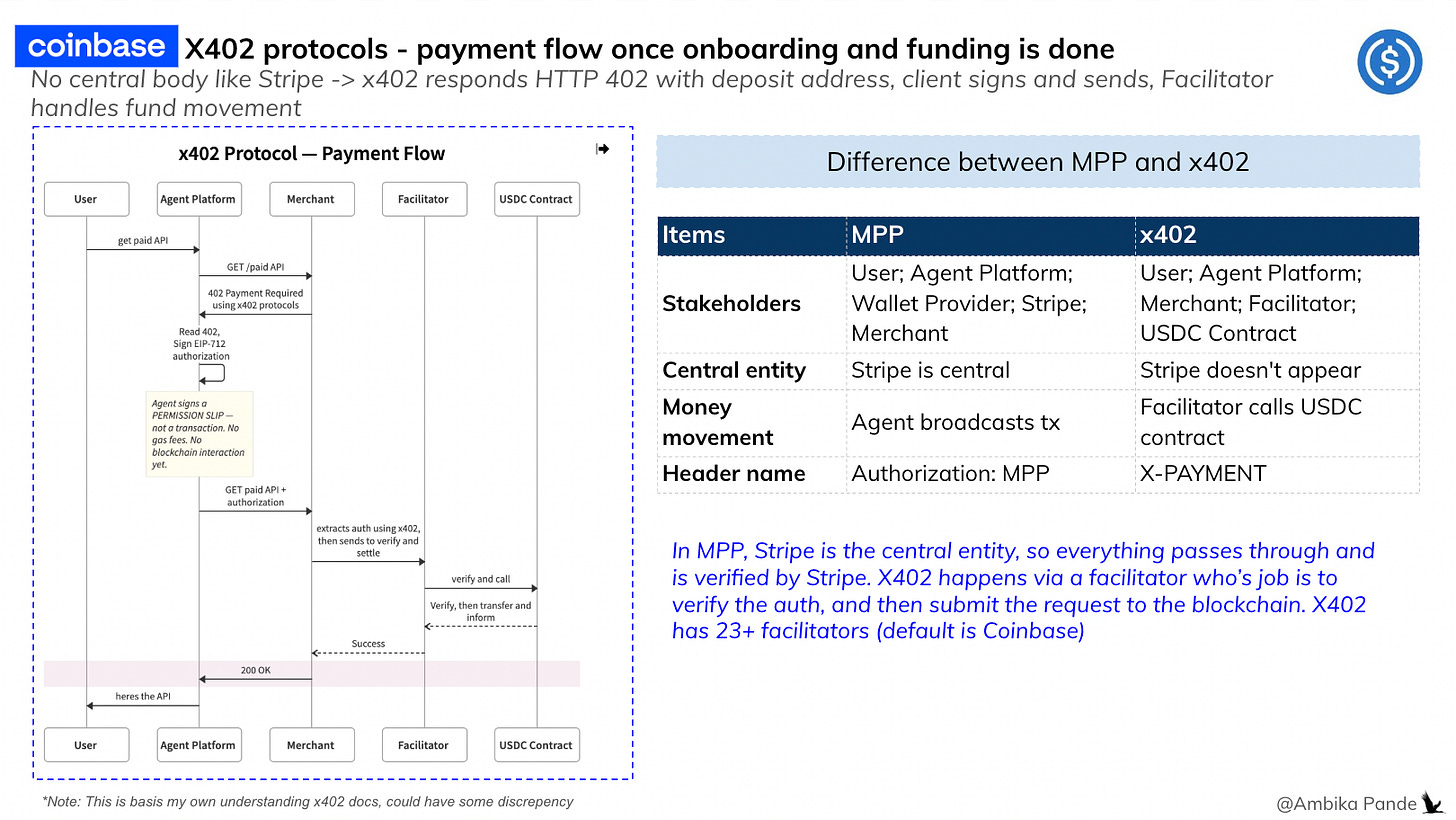 The two major differences between x402 and MPP is: in MPP, Stripe is the only verifying entity. In 402, Coinbase is the default, but there are multiple. And the second: x402 ONLY supports stablecoins, not fiat, unlike MPP, which supports both
