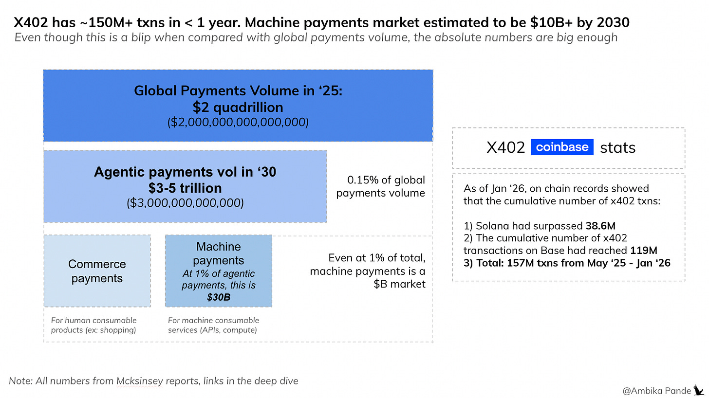 This is a big deal. 150M transactions are not nothing. Granted, out of a global payment volume (# of transactions) of 3.6T, this is 0.00004%. A blip. But in terms of absolute transactions, and potential market size, ($30B), the number we calculated earlier, this could be big. And that is probably why everyone is rushing to launch their own machine payment protocols - like Stripe with MPP, and x402 with Coinbase.