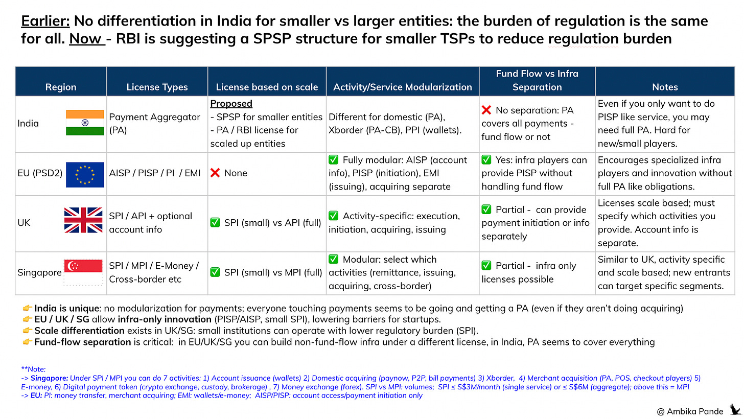 There is no license separation between infra and actual fund flow, which results in everyone going after the same umbrella PA license in India, despite having no play in money movement. Example: even if you are NOT involved in fund flow, but just in payment initiation (think, a payment orchestrator, or even a UPI app), you would still need to probably get a PA license. This severely hits smaller fintechs which may never be involved in fund flow.